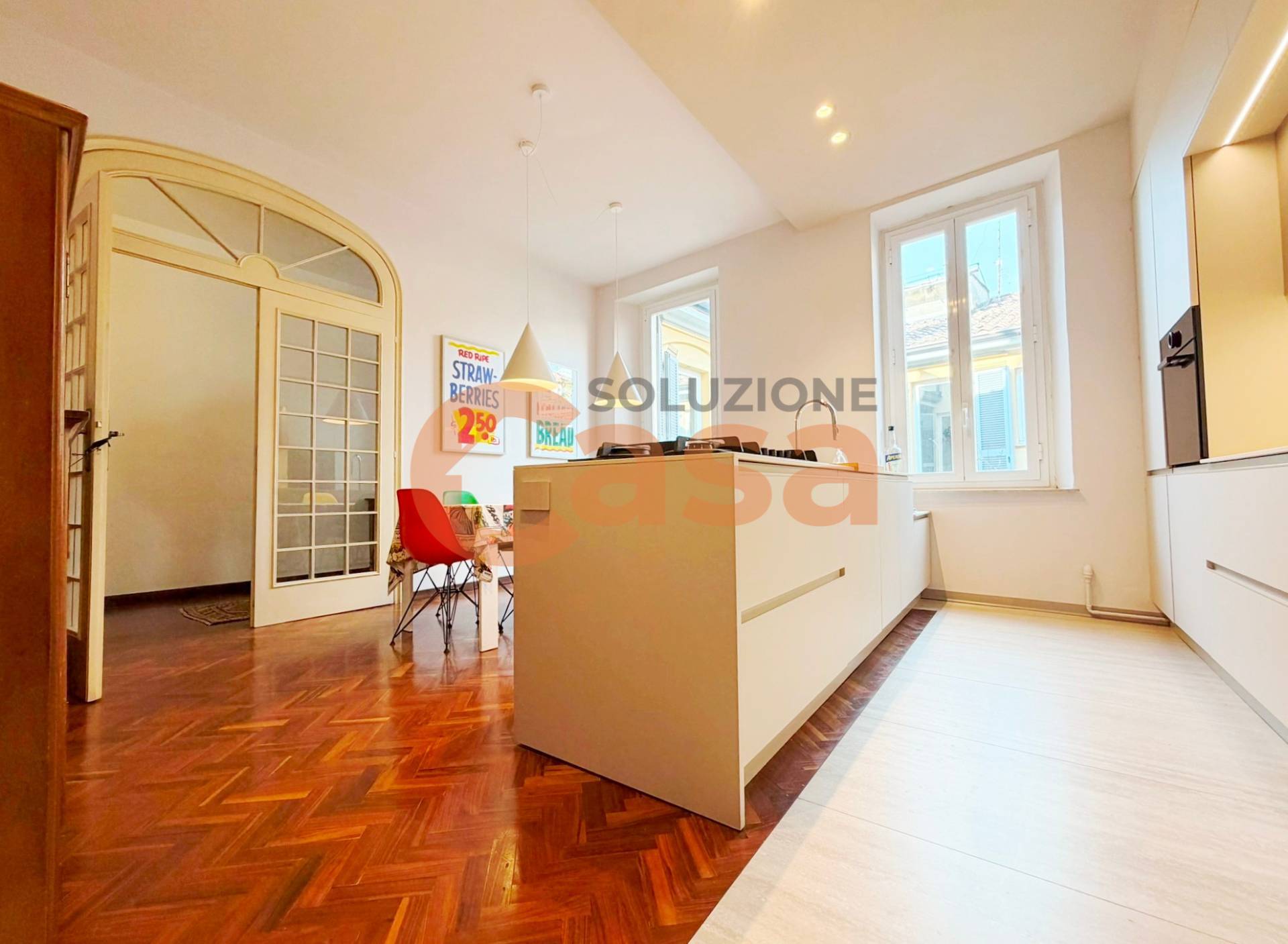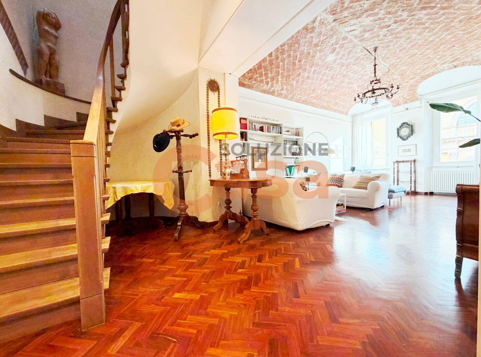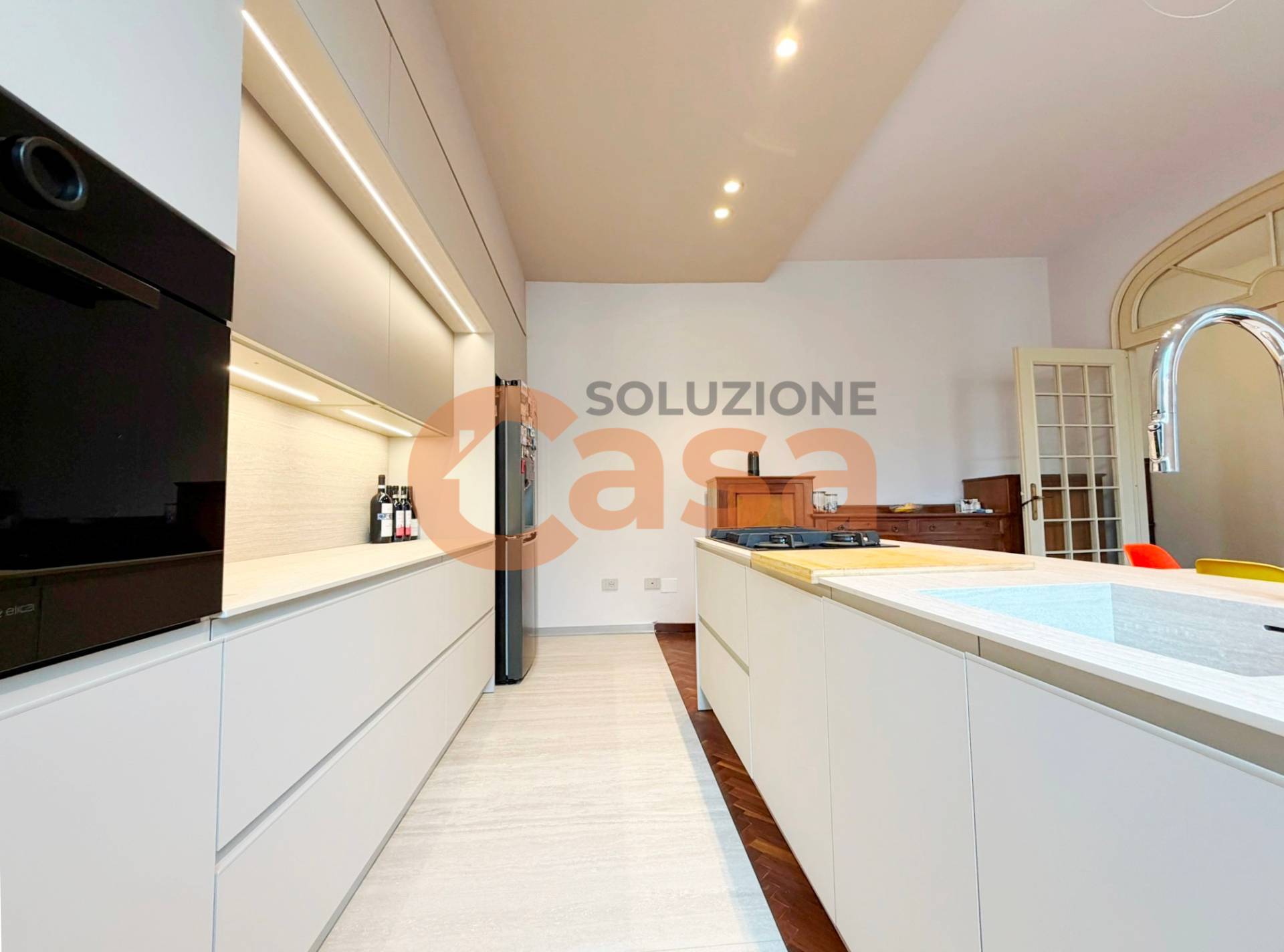 L'appartamento si compone, al piano, con ingresso signorile con ampia galleria, soggiorno doppio con zona studio, cucina abitabile NUOVA, lavanderia, bagno di servizio e ripostiglio.