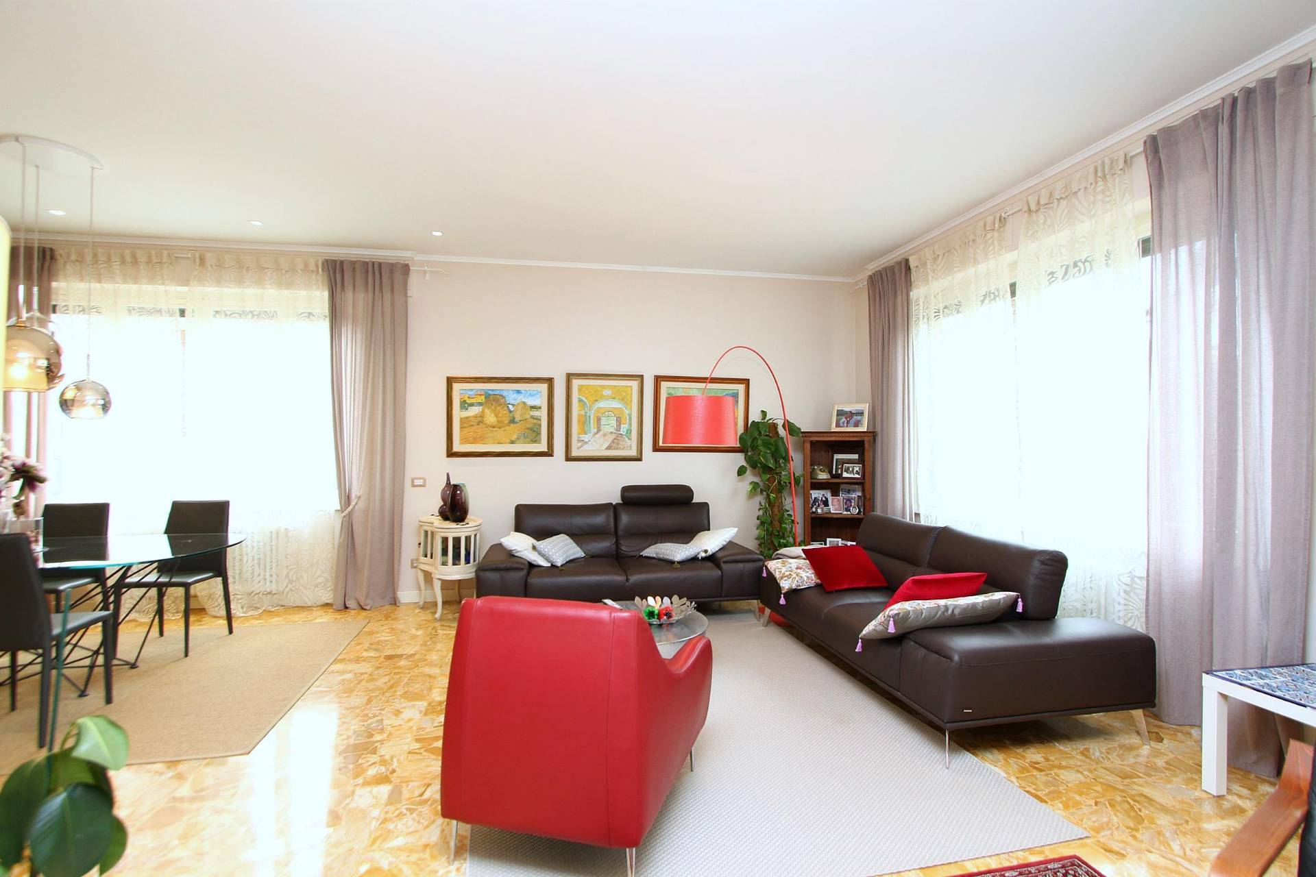 La propriet circondata da un ampio parco completamente recintato di oltre 3000 mq. Negli anni Sessanta , testimoni del boom economico italiano , venne realizzata questa struttura che oggi stata sapientemente rinnovata due anni fa dagli attuali proprietari . Lappartamento posto in vendita oltre allentrata comune con laltro appartamento al piano superiore , ha la possibilit di un entrata completamente indipendente . Entrando siamo accolti da un piacevole disimpegno che ci accompagna al grande soggiorno ad angolo , luminoso su entrambe i suoi lati grazie alle ampie finestre . Sullaltro lato , abbiamo invece la cucina abitabile , a cui seguono i due bagni entrambe con finestra e doccia , ed un altro salotto uso stanza TV o lettura, la zona notte invece composta da tre ampie camere da letto . La zona abitabile si completa con uno studio , e due ripostigli di cui uno uso lavanderia . Ognuna di queste stanze ha un proprio terrazzo . Dalle scale comuni si accede al terzo piano dove abbiamo un ampio spazio tipo mansarda con una terrazza panoramica sulla vallata e sul centro storico.
