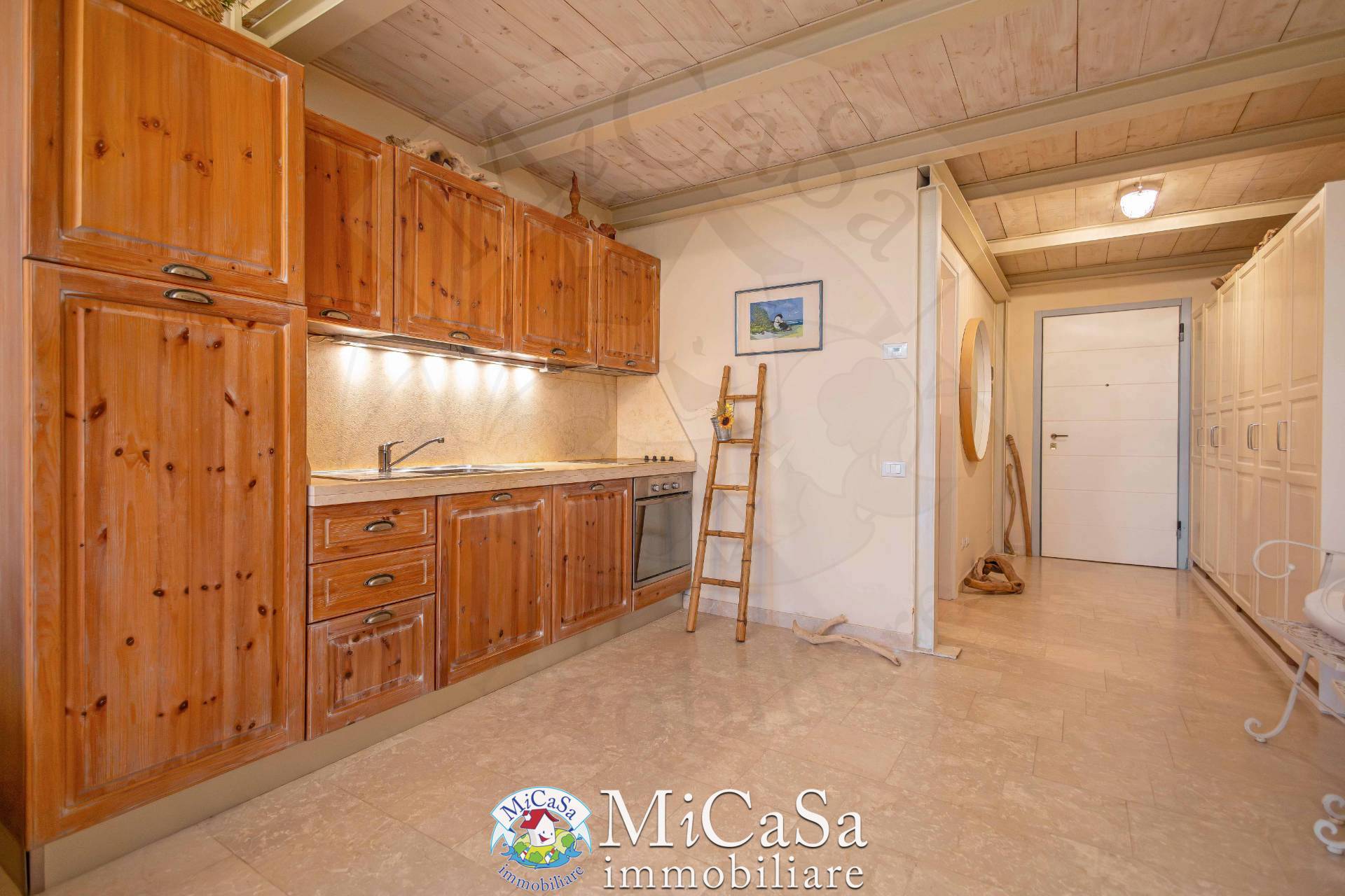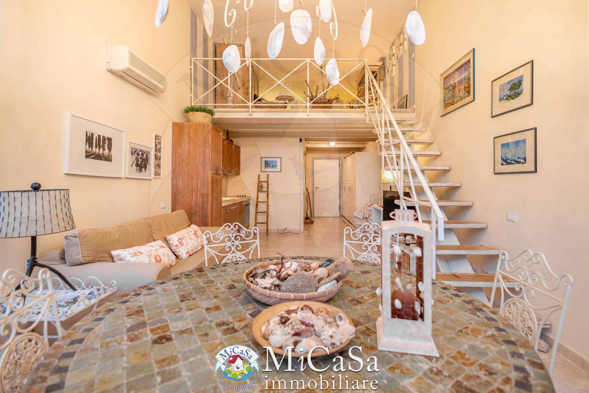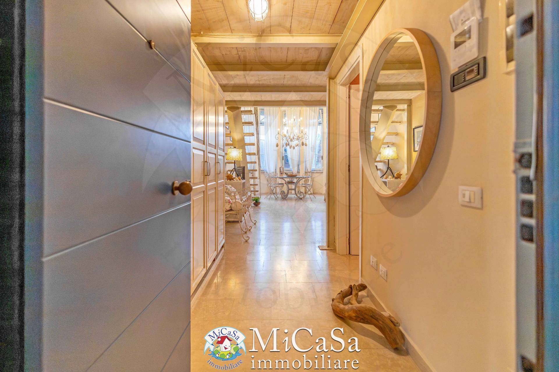 Il pavimento del living e dei corridoi in marmo beige, , e la cucina artigianale ha piano di lavoro e alzata in marmo Crema Luna. La zona pranzo scenografica, con grande tavolo rotondo e lampadario in ferro e madreperla, il cuore conviviale, mentre il living arredato con divano letto e area relax rende labitazione versatile e pronta da vivere.