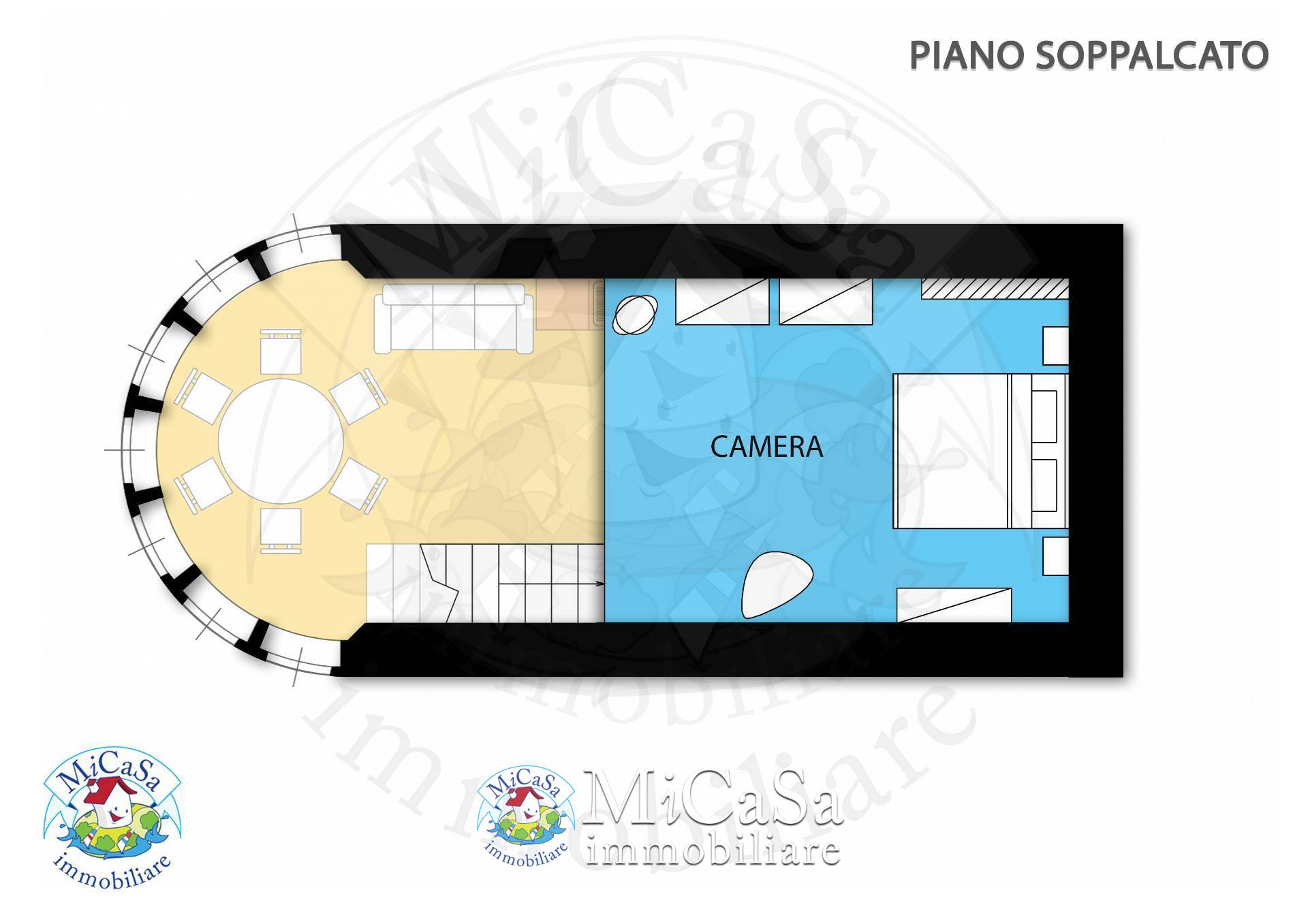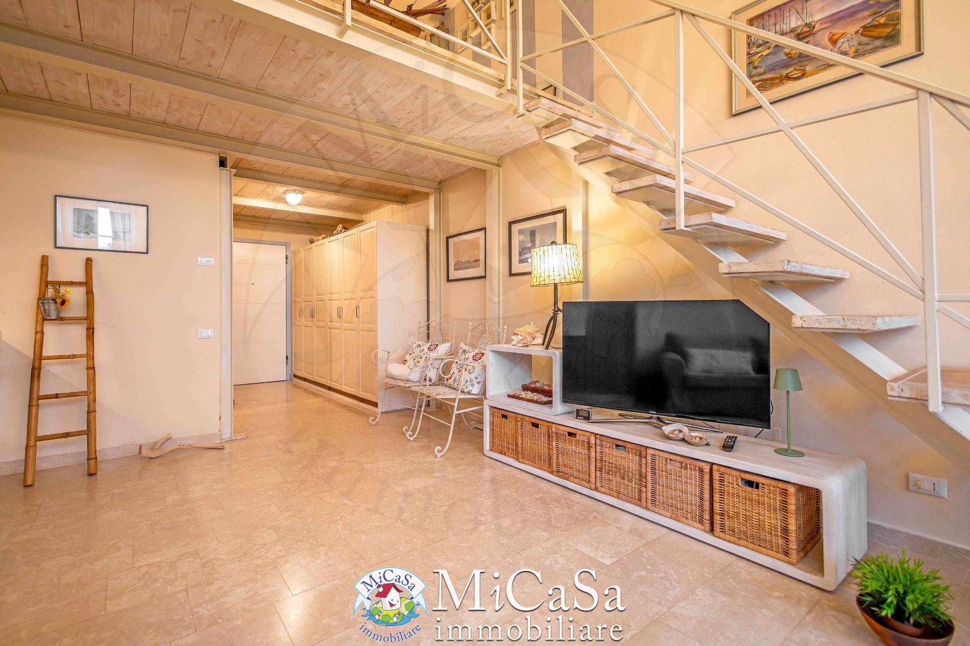 Il soppalco notte di circa 20 mq, arredato con letto matrimoniale e armadiature, offre vista sulla duna e scorci di mare. Completano la propriet posto auto esclusivo, cantina.