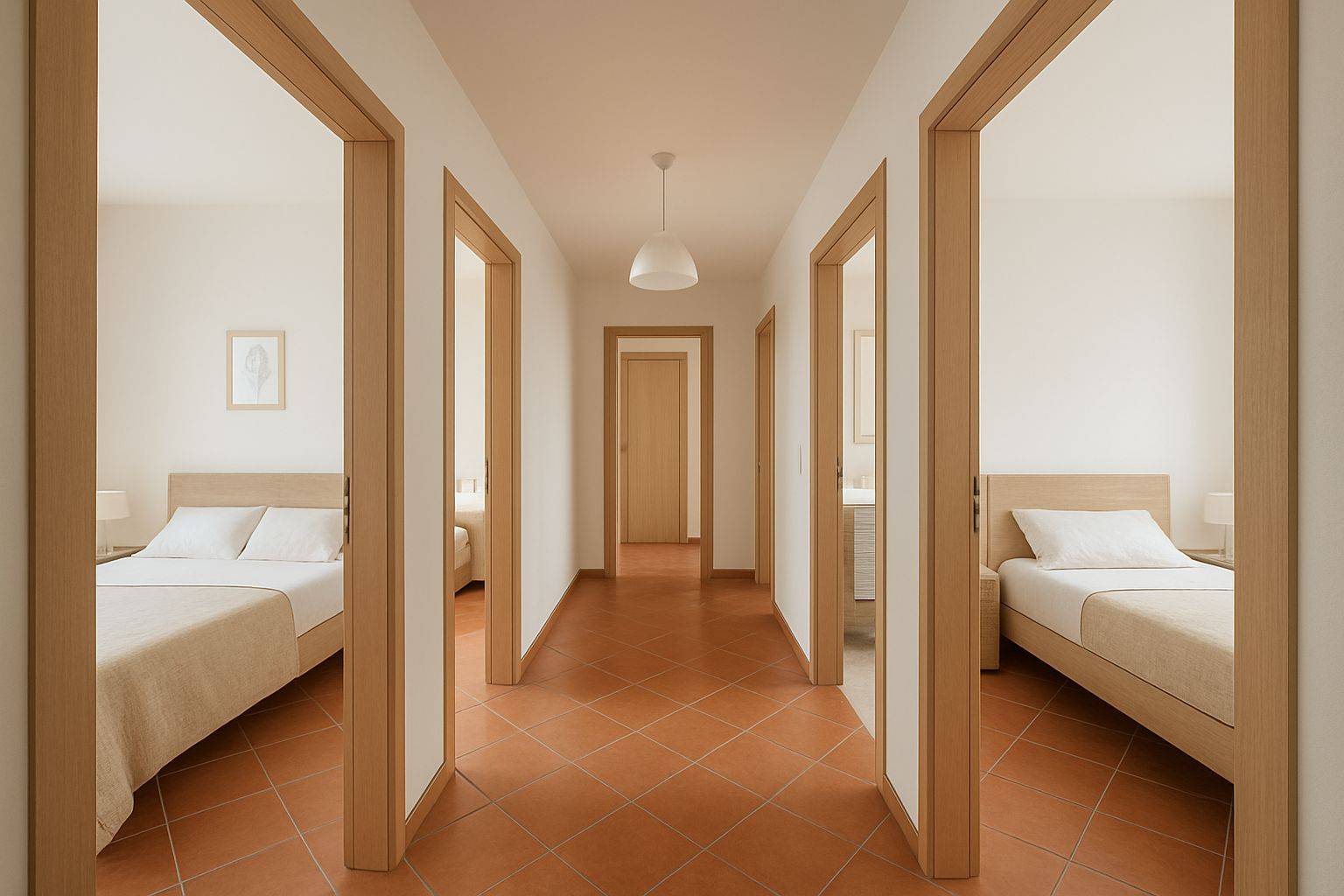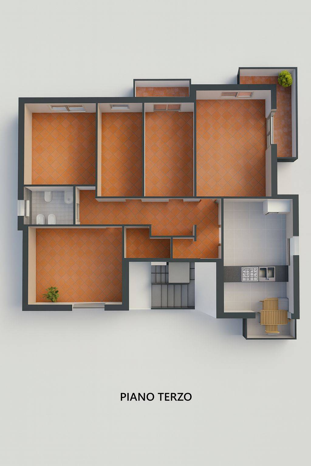 Dispone di 6 vani complessivi, tra cui 5 spaziose camere da letto, 2 bagni, 3 terrazzi e cucina abitabile.