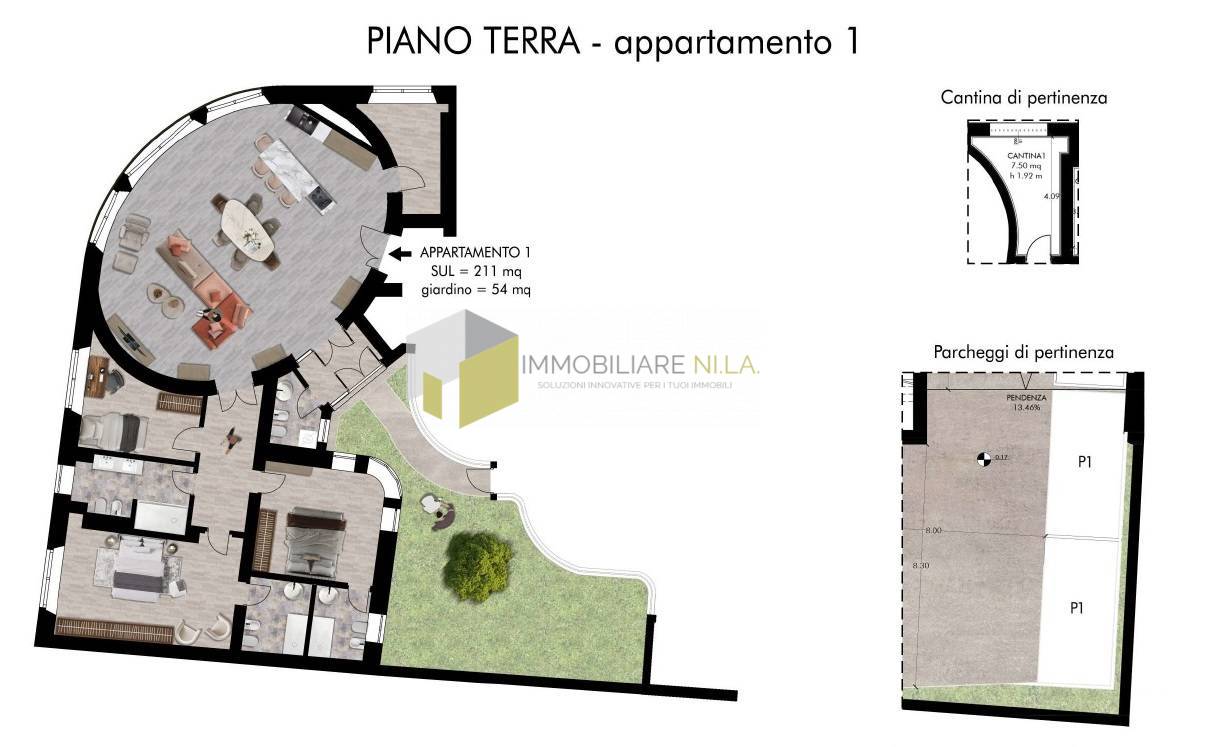 Consegna prevista a dicembre 2027. Le soluzioni disponibili sono: UNIT? 1 - abitazione di 211 mq situata al piano terra, composta da ingresso nellampia zona giorno di oltre 70 mq netti con angolo cottura ed accesso al giardino di propriet, grande ripostiglio, disimpegno notte che conduce a tre camere di cui due ampie matrimoniali entrambe con bagno privato ed altri due bagni dotati di finestra.