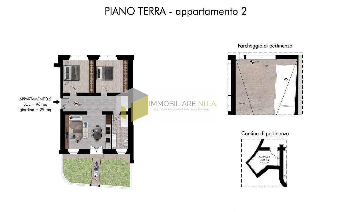Completa la propriet il giardino di 29 mq, una cantina al piano seminterrato e un posto auto esclusivo.