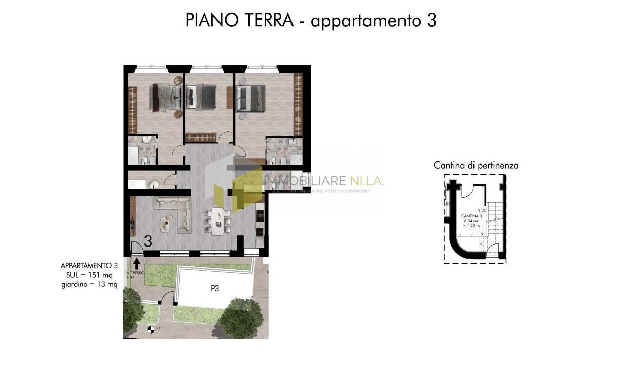 RICHIESTA 424.000 Euro UNIT? 3 abitazione di 151 mq situata al piano terra, composta da piccolo giardino di propriet che conduce allingresso nellampia zona giorno di oltre 30 mq netti con angolo cottura, disimpegno notte che conduce a tre ampie camere matrimoniali di cui due dotate di bagno privato ed altro bagno con finestra e grande ripostiglio con zona lavanderia.