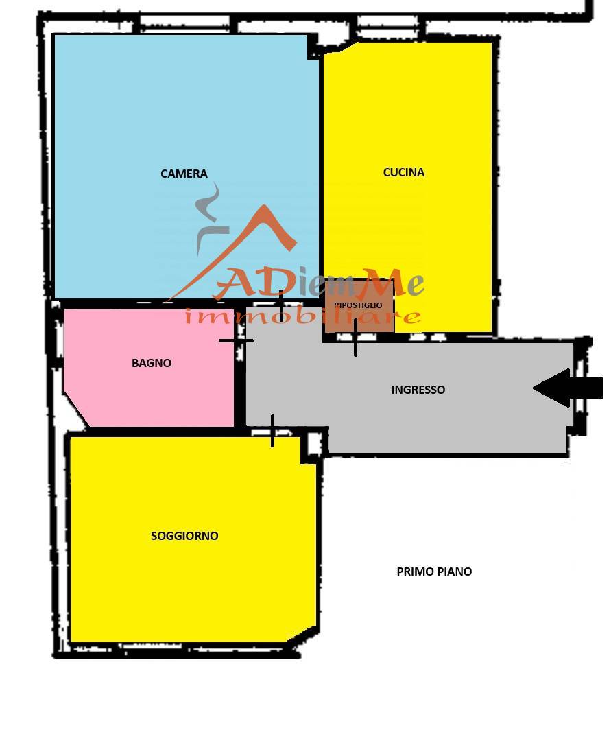 L'appartamento collocato al primo piano ed composto da: ampio vano d'ingresso, cucina abitabile, ripostiglio, bagno finestrato, camera matrimoniale e cameretta/studio.