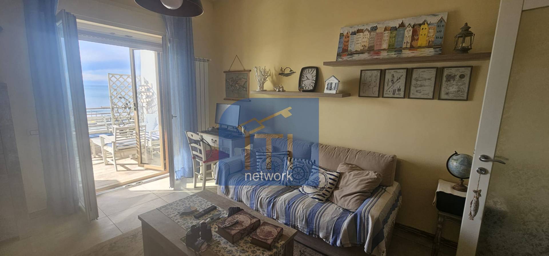 L'immobile composto da un salone con accesso sul terrazzo con stupenda vista mare, camera matrimoniale, ampia cameretta, cucina abitabile, servizio finestrato, ampio terrazzo perimetrale e box. Tutti gli ambienti godono di splendida vista mare e accesso all'ampio terrazzo.