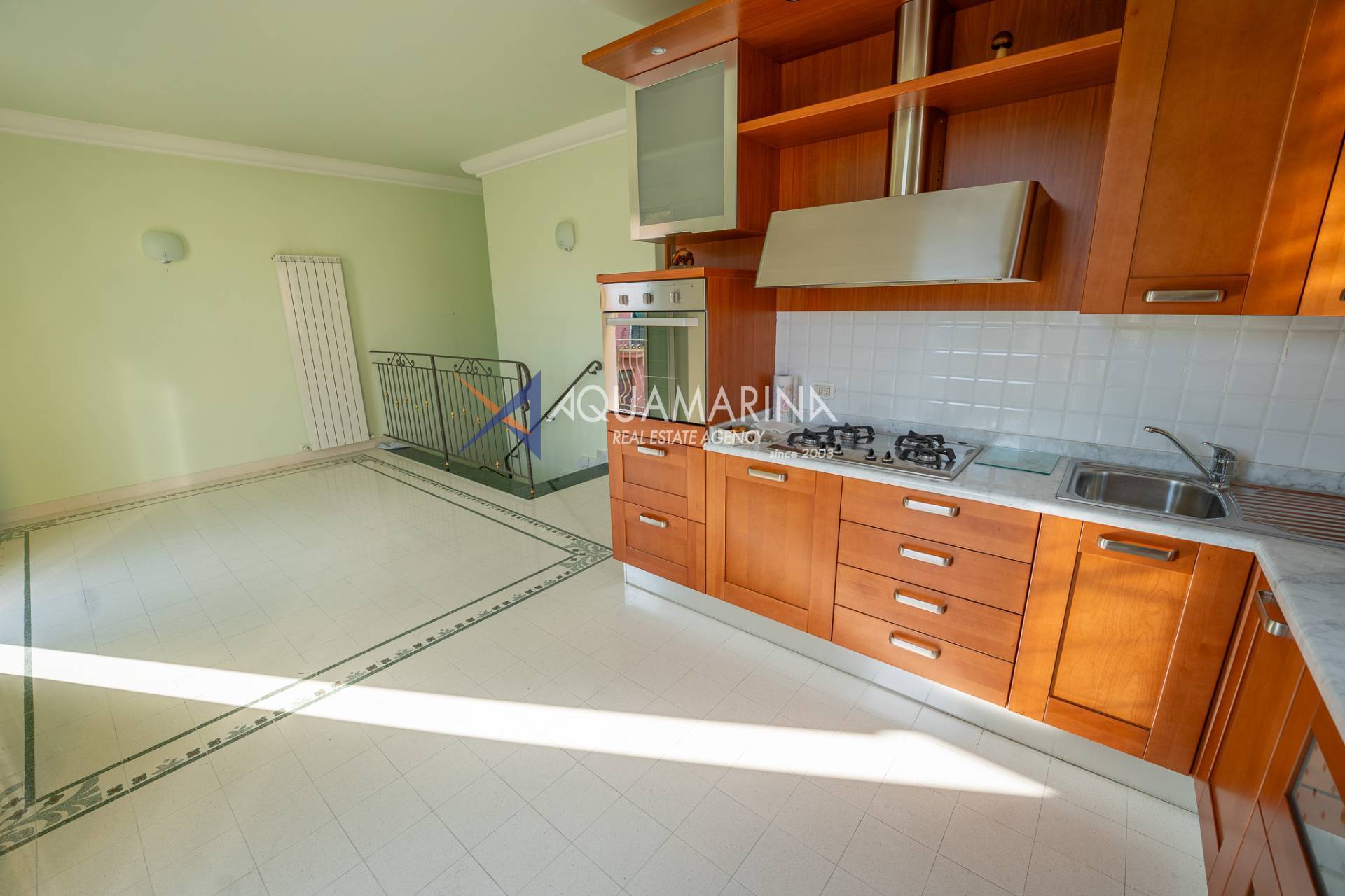 La cucina angolare a vista si affaccia su un'accogliente area living ed caratterizzata da due ampie porte-finestre che permettono luscita sul balcone abitabile, garantendo unottima luminosit naturale per tutto larco della giornata.
