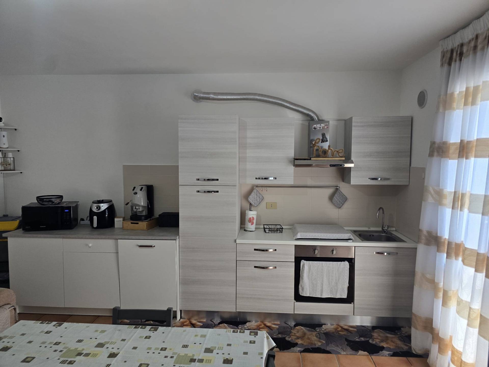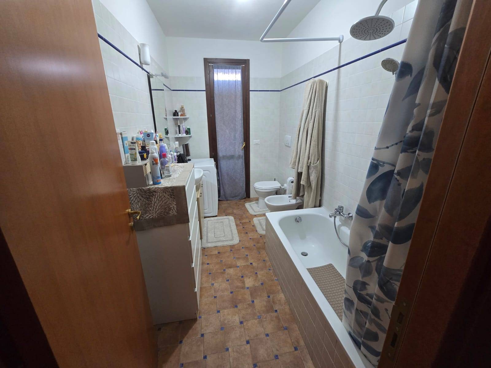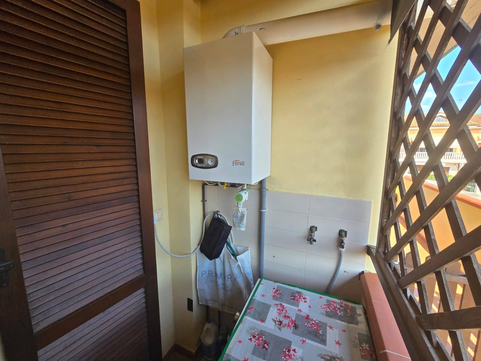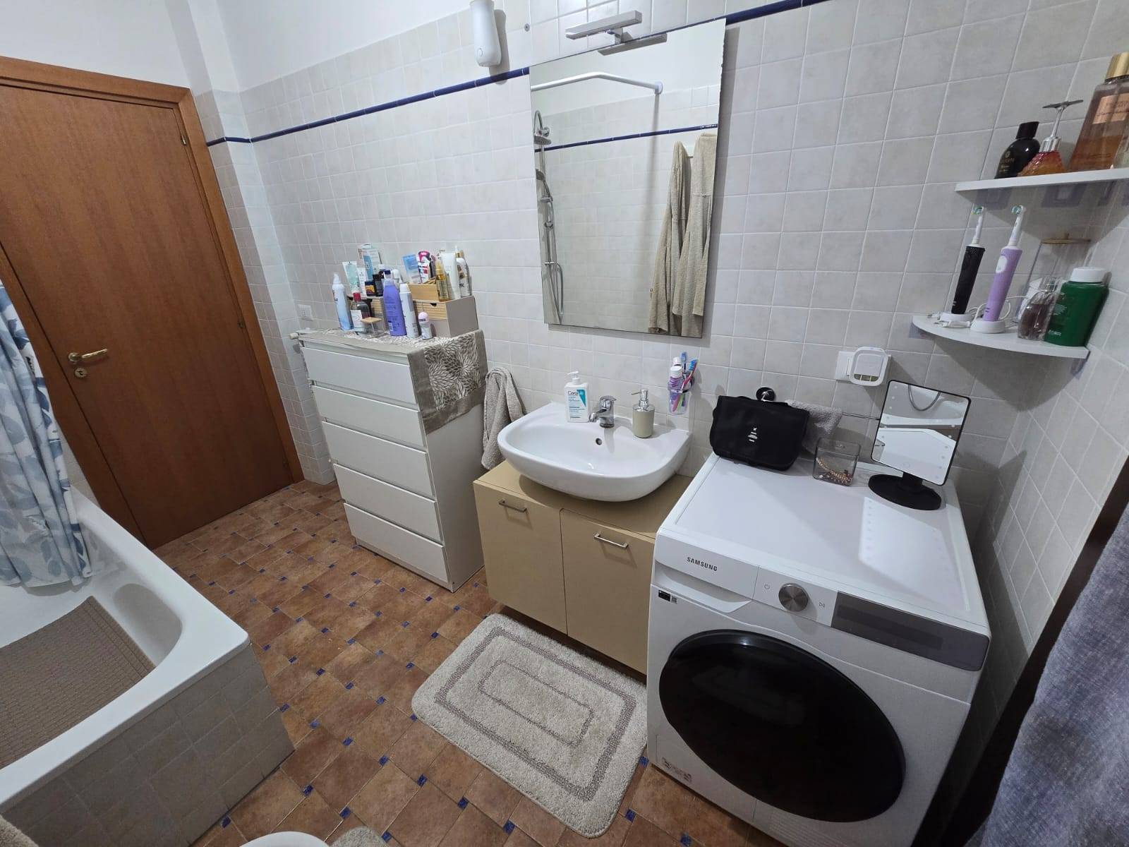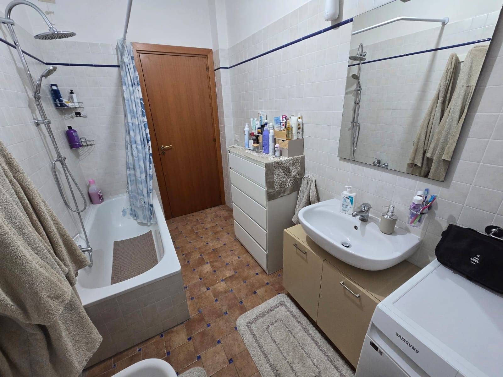 Accesso dal terrazzo direttamente nella zona giorno open space con cucina a vista, disimpegno notte con accesso al sottotetto tramite scala retrattile, due camere da letto di cui una matrimoniale con secondo terrazzo ed una singola, un piccolo ripostiglio, bagno con vasca e porta-finestra che ci conduce ad un terzo balcone coperto con caldaia ed attacco per lavatrice.