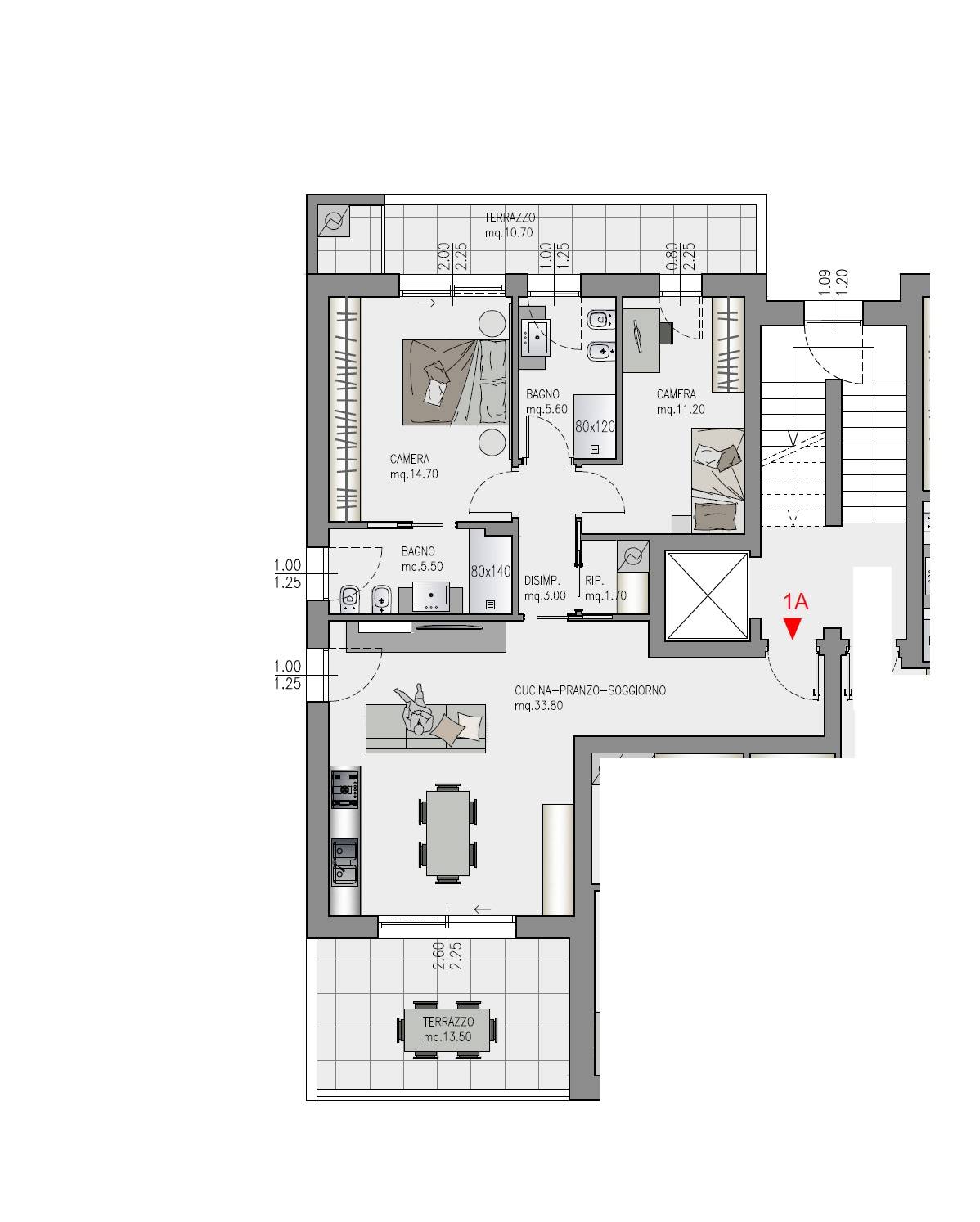Pordenone centralissimo, in ottimo contesto cittadino, appartamento al primo piano facente parte di un condominio di nuova realizzazione in classe A. Composto da ingresso, zona giorno di 33 mq con cucina open space e uscita in terrazzo abitabile, due camere, due bagni finestrati, secondo terrazzo, ripostiglio con lavanderia.