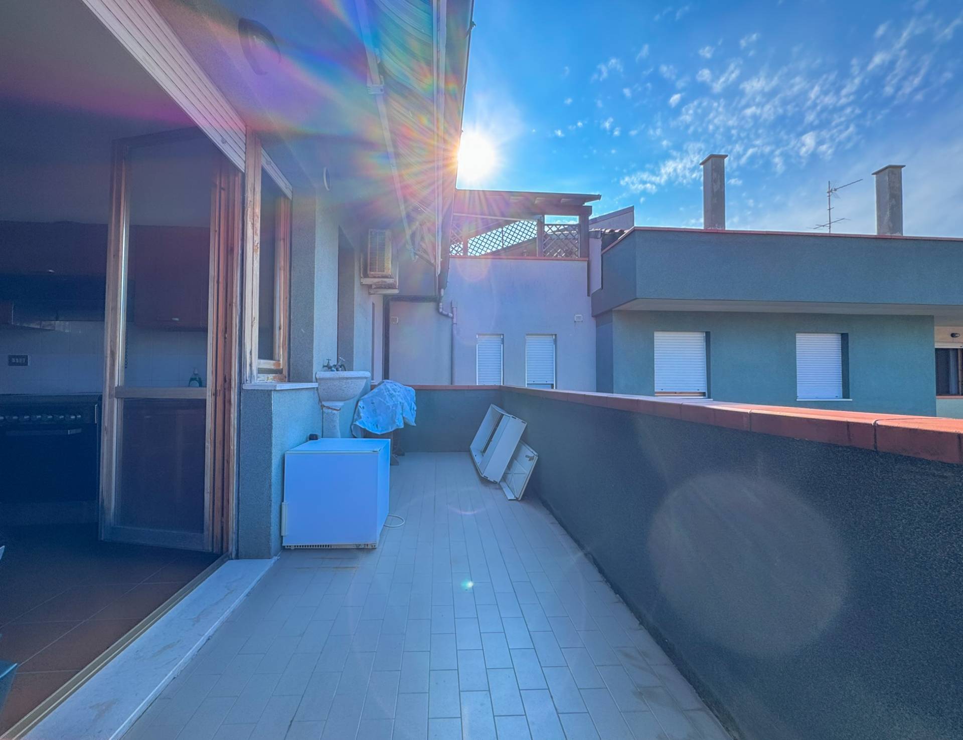 L'ingresso si apre su un luminoso soggiorno, con ripostiglio sulla destra ideale per lasciare scarpe e giubbini e come dispensa, Il soggiorno con angolo cottura ampio e accogliente e riscaldato da un camino e si affaccia sul grande terrazzo, ideale per cene allaperto, momenti di relax o semplicemente per godersi il sole e la brezza marina.
