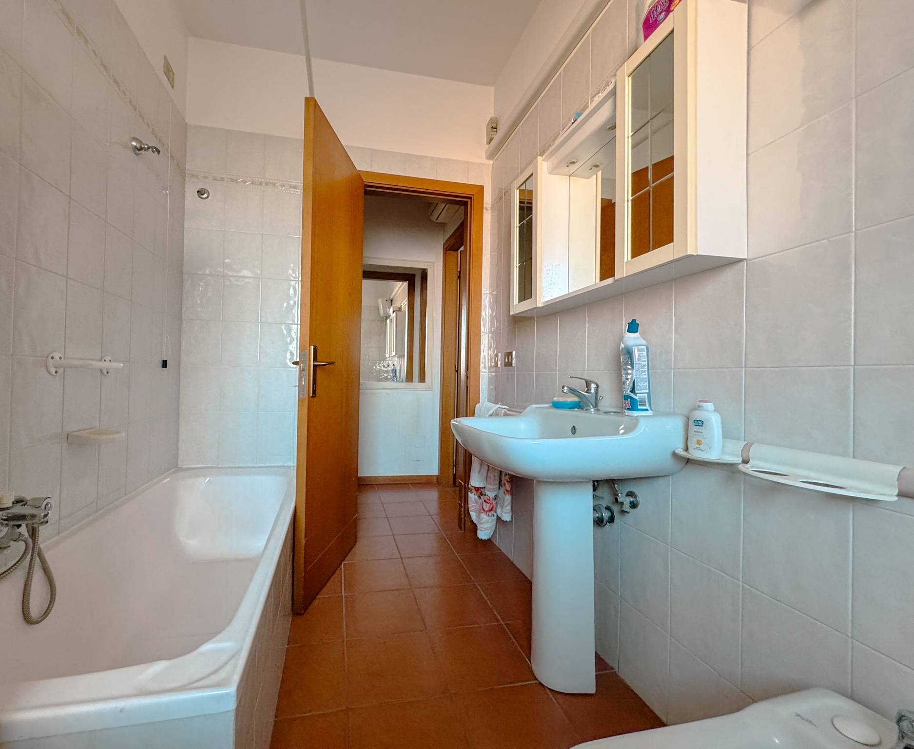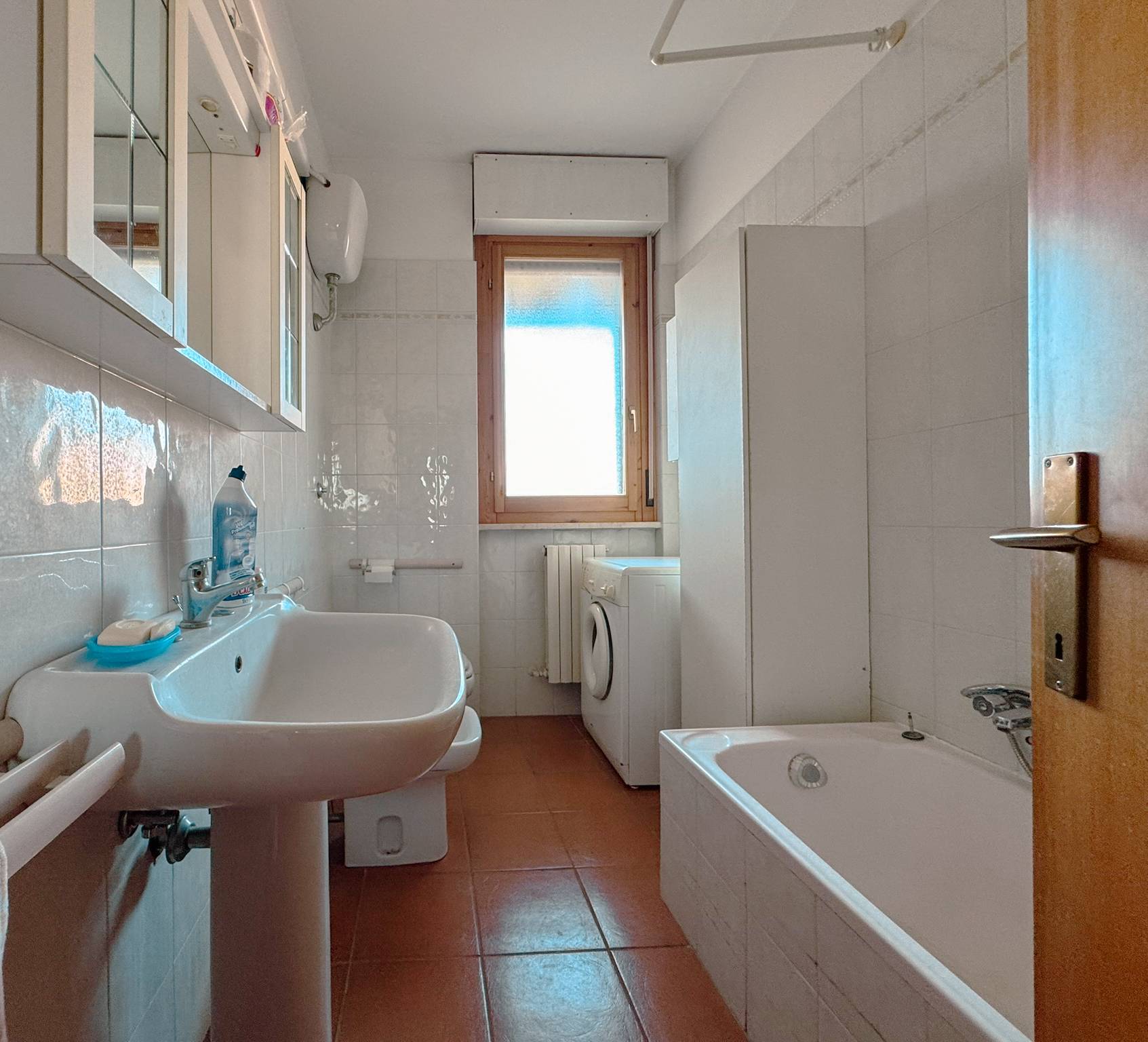 Il bagno con finestra funzionale e ben illuminato, con zona lavanderia.