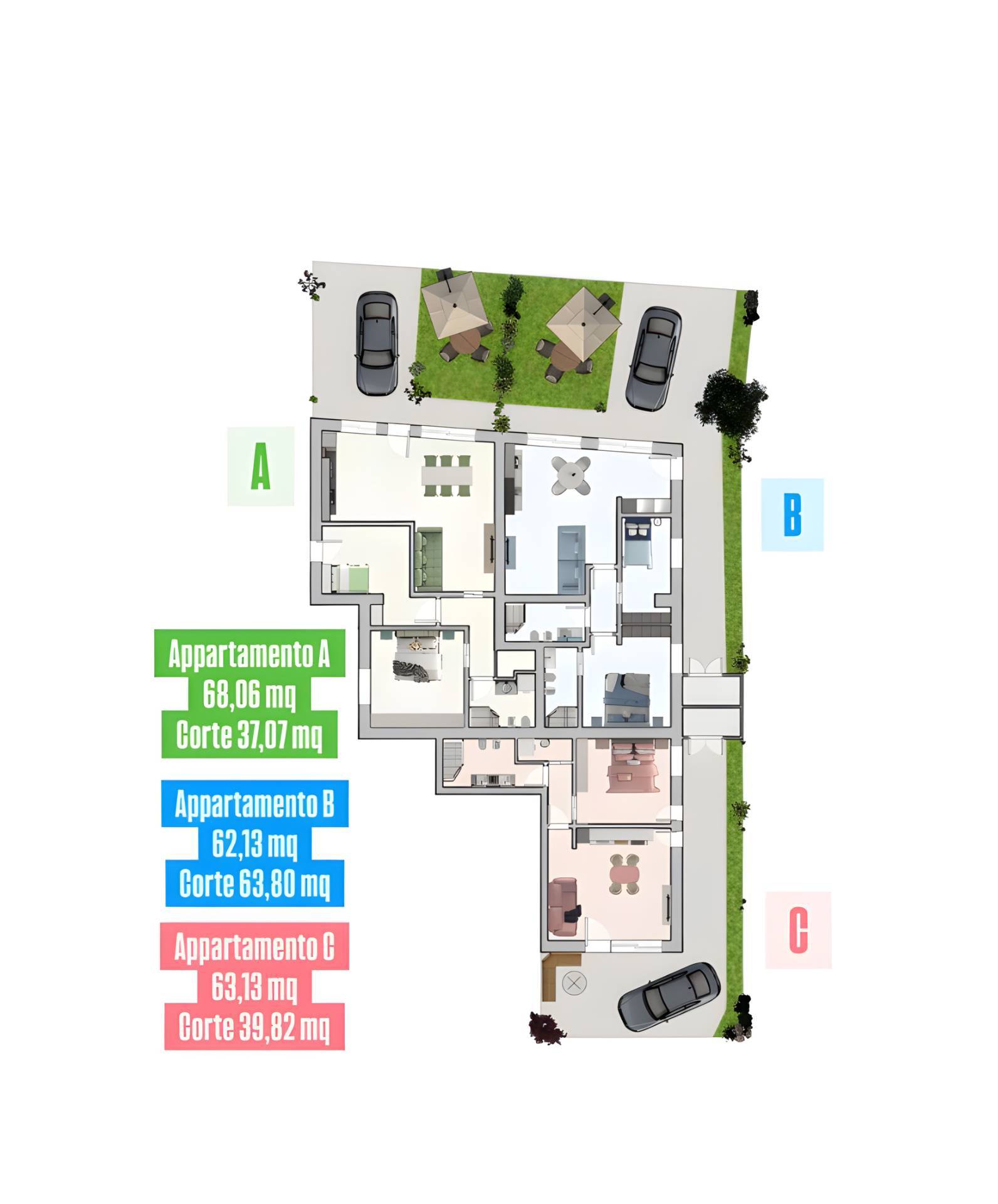 Gli appartamenti sono inseriti in un ottimo contesto abitativo e saranno composti da soggiorno con cucina a vista, due camere, servizi, completi di corte esterna e posti auto. Le unit abitative verranno realizzate secondo le ultime tecnologie costruttive, con particolare attenzione alle materie prime selezionate, completi di riscaldamento e raffrescamento a pompa di calore, impianto fotovoltaico, infissi certificati, predisposizione allarme e videocitofono.