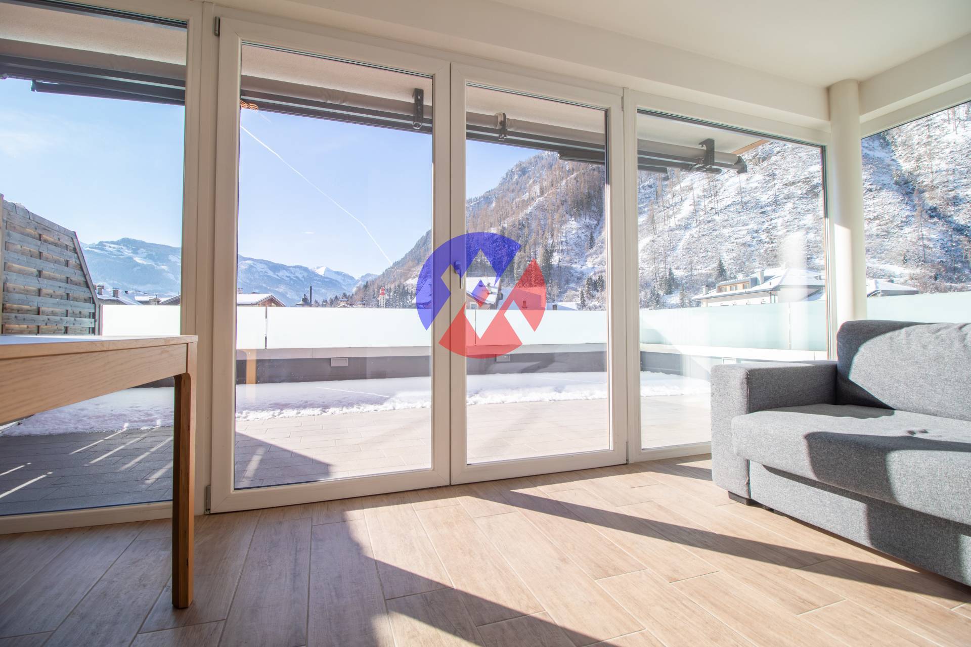 APPARTAMENTO L'appartamento situato al piano primo ed cos suddiviso: - Ingresso da giroscale comune con comoda nicchia con attacco per la lavatrice - Soggiorno molto luminoso con ampie vetrate - Angolo cottura - Corridoio - Camera matrimoniale - Camera con possibilit di letto a castello - Bagno cieco con doccia e doppio lavabo - Spettacolare terrazzo panoramico completamente esposto al sole con tenda elettrica Pertinenze - Box auto - Cantina privata POSIZIONE L'immobile si trova in zona molto tranquilla e soleggiata, a poca distanza dal centro di Predazzo e tutti i principali servizi.