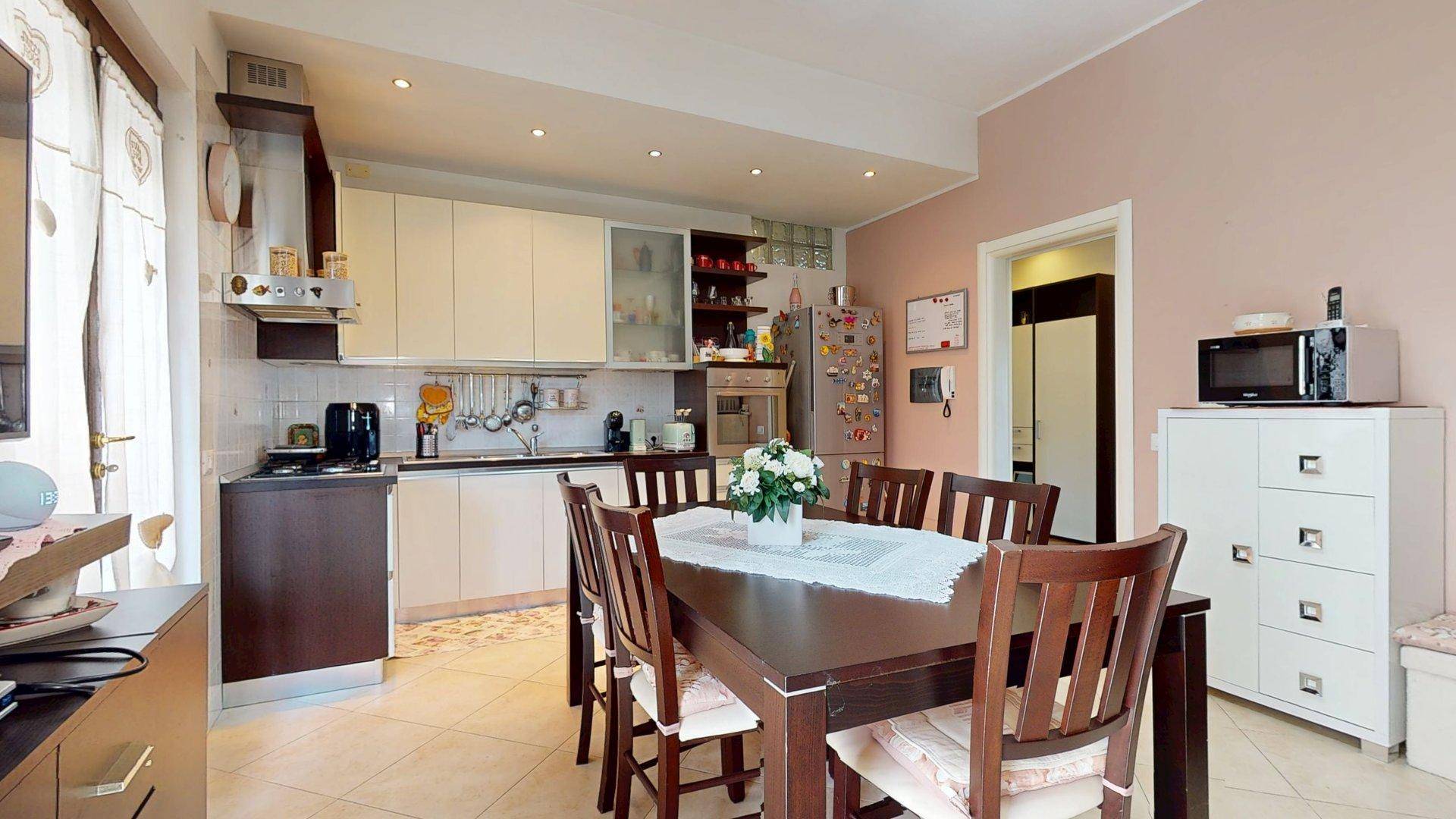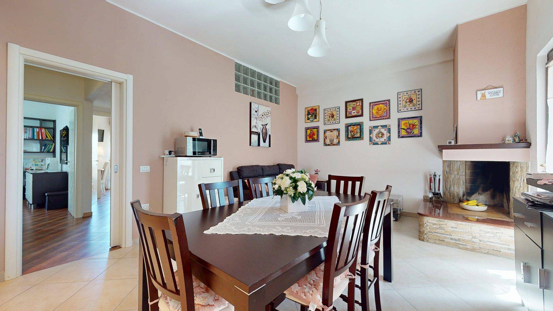 Da qui, la vista e lo spazio si estendono fluidamente verso la grande cucina abitabile, vero cuore pulsante della casa. Questo ambiente, ideale per la convivialit quotidiana, reso unico dalla presenza di un suggestivo camino a legna e dallaffaccio diretto su unampia veranda coperta, caratterizzata da finiture in legno e steccato, una vera e propria estensione del living perfetta per momenti di relax allaperto.