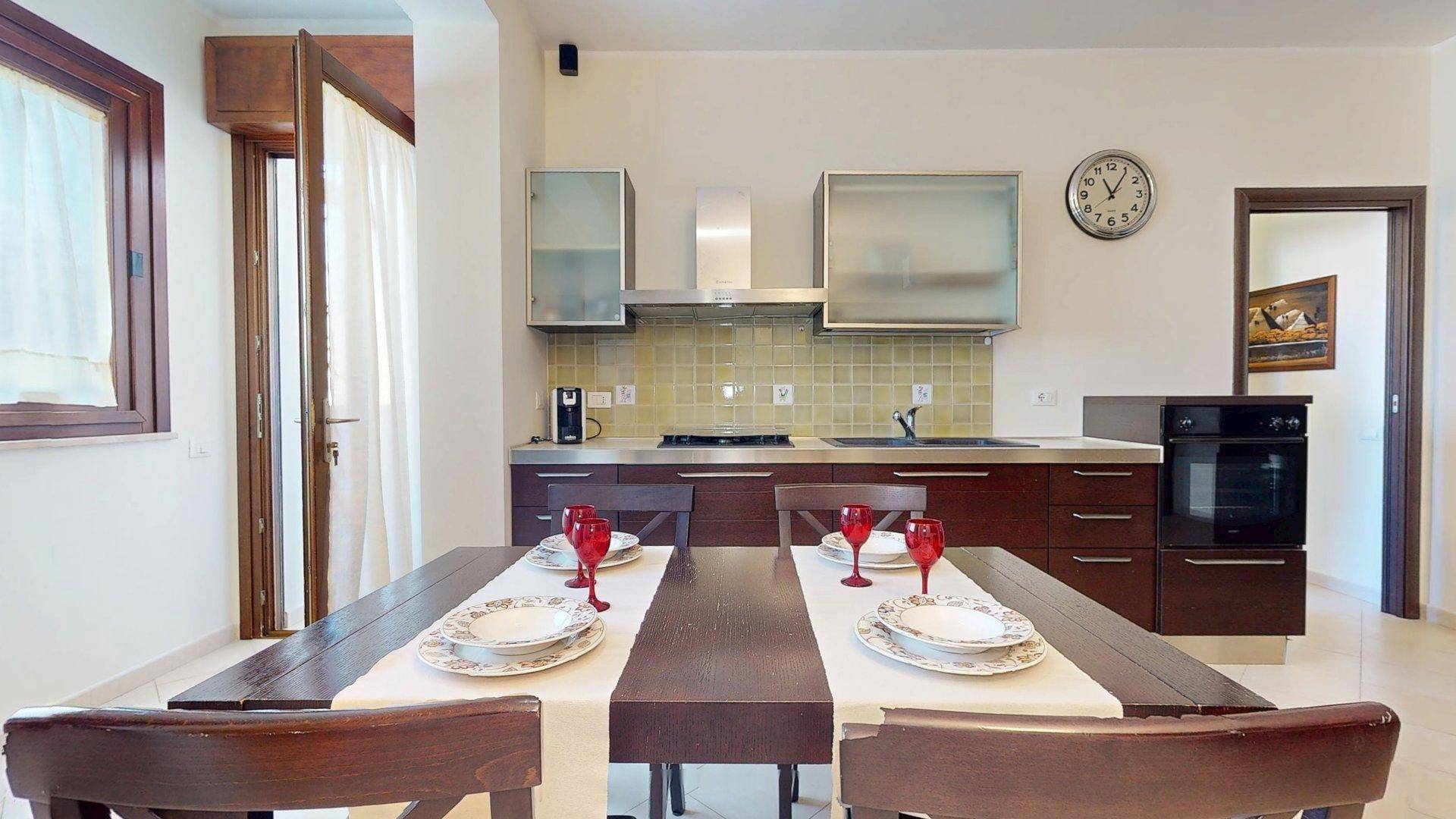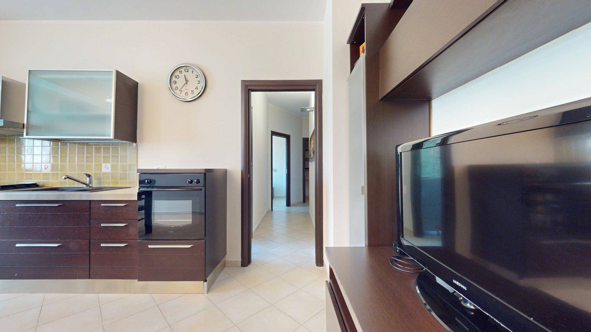 Lingresso si apre direttamente sulla zona giorno, un ambiente spazioso che unisce il soggiorno all'angolo cottura.