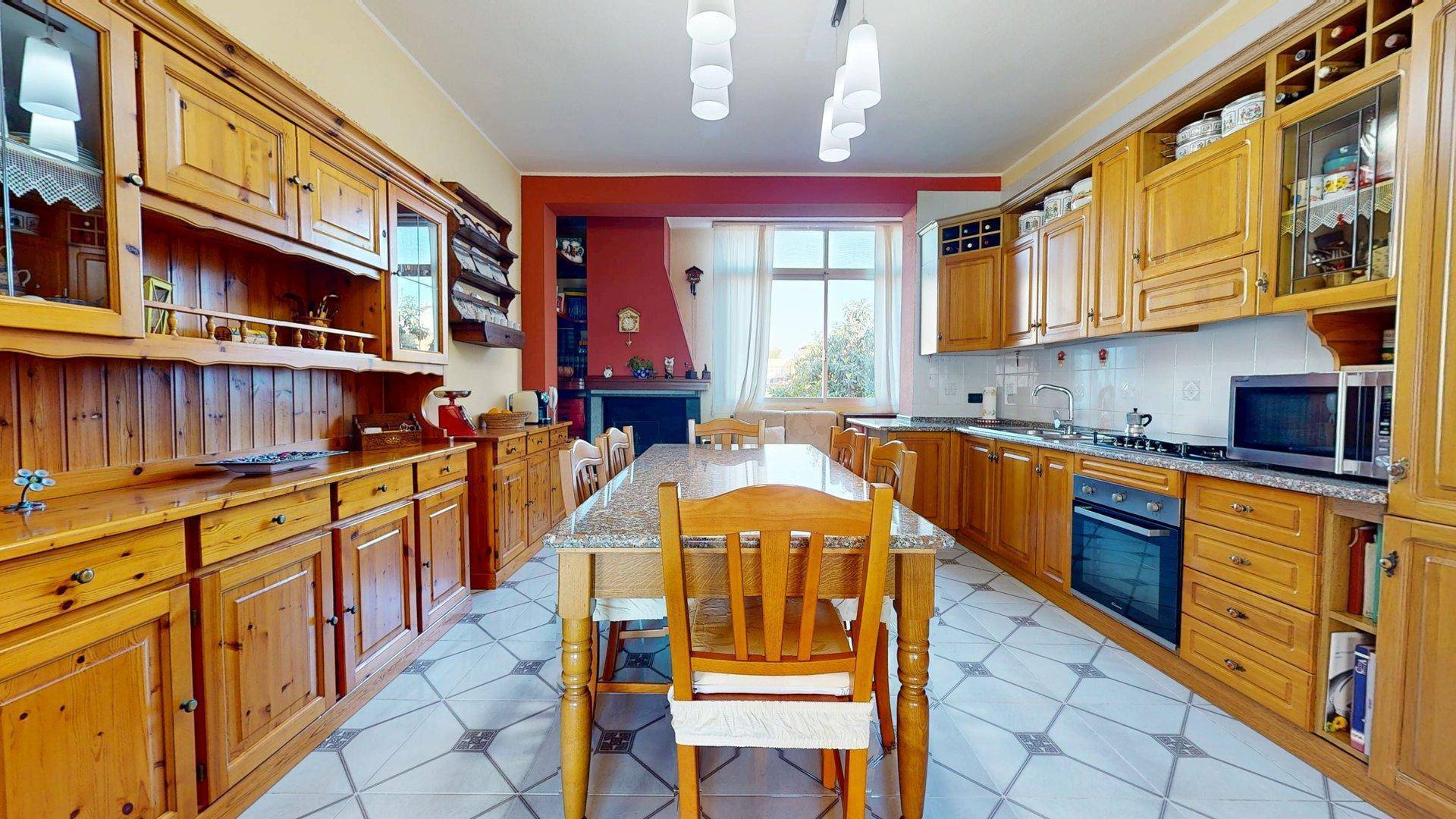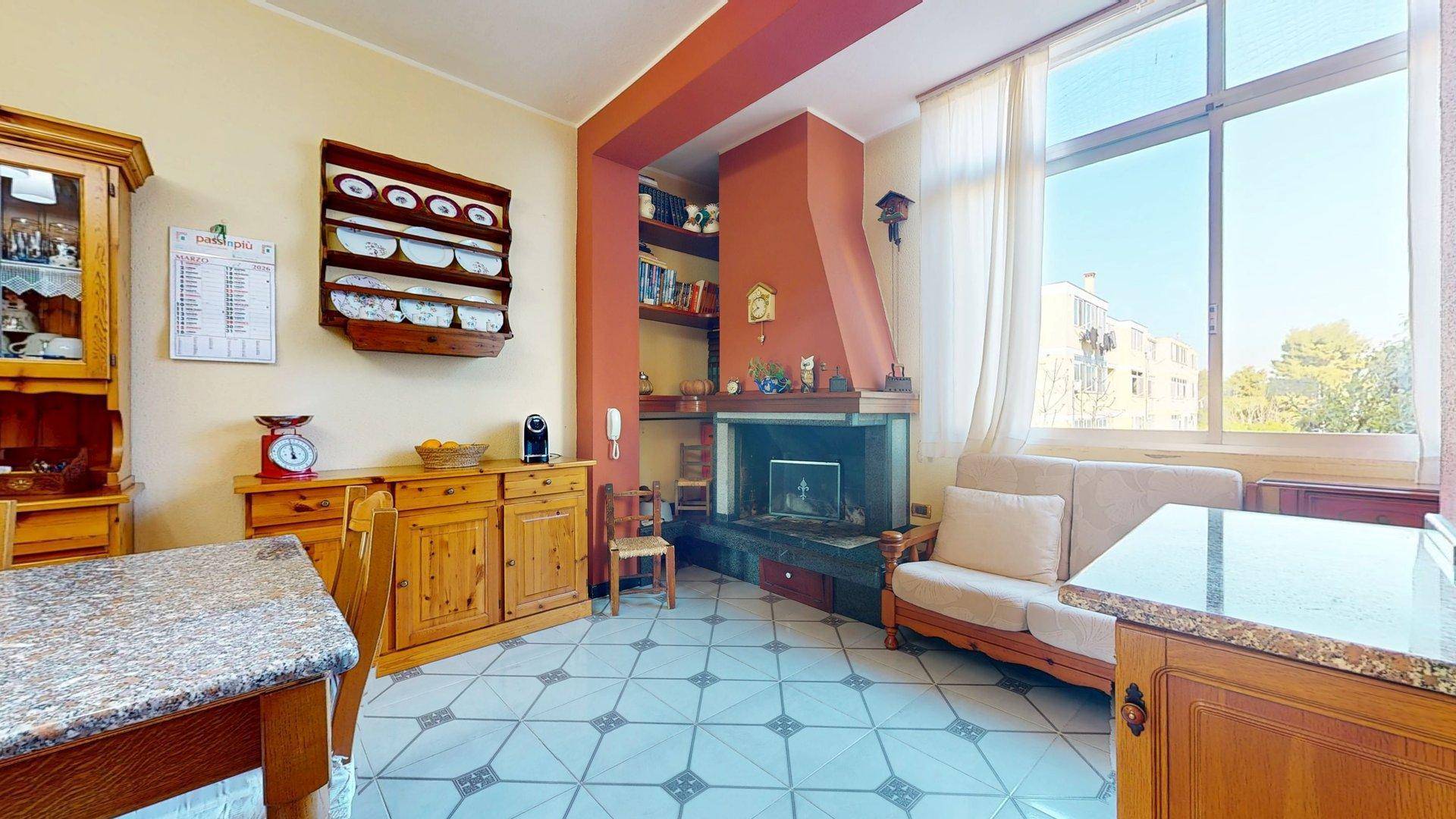 L'appartamento si apre su un accogliente ingresso che introduce in un ampio soggiorno, il quale risulta direttamente collegato alla cucina abitabile, dotata di un funzionale camino a legna che dona calore e carattere a tutta la zona giorno.
