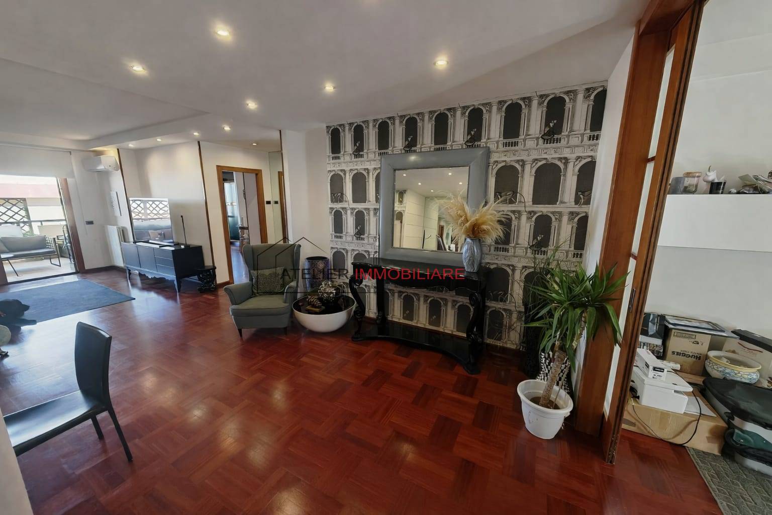 Limmobile si distingue per la presenza di una pregiata pavimentazione in parquet a mosaico in legno massello essenza Doussi, posato a disegno geometrico, elemento che conferisce continuit, calore e raffinatezza a tutti gli spazi.