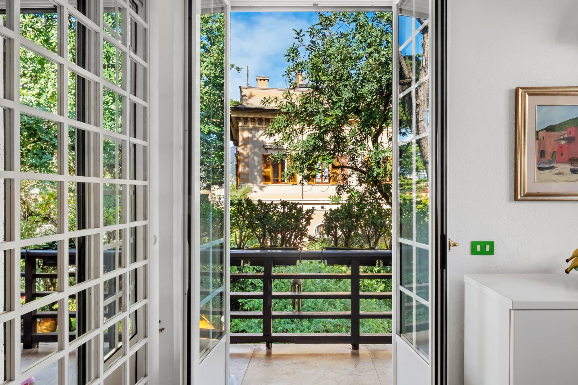 Dal soggiorno si accede a un primo balconcino con affaccio sul verde del parco e scorcio mare, ideale per una colazione allaperto o per concedersi un momento di relax.