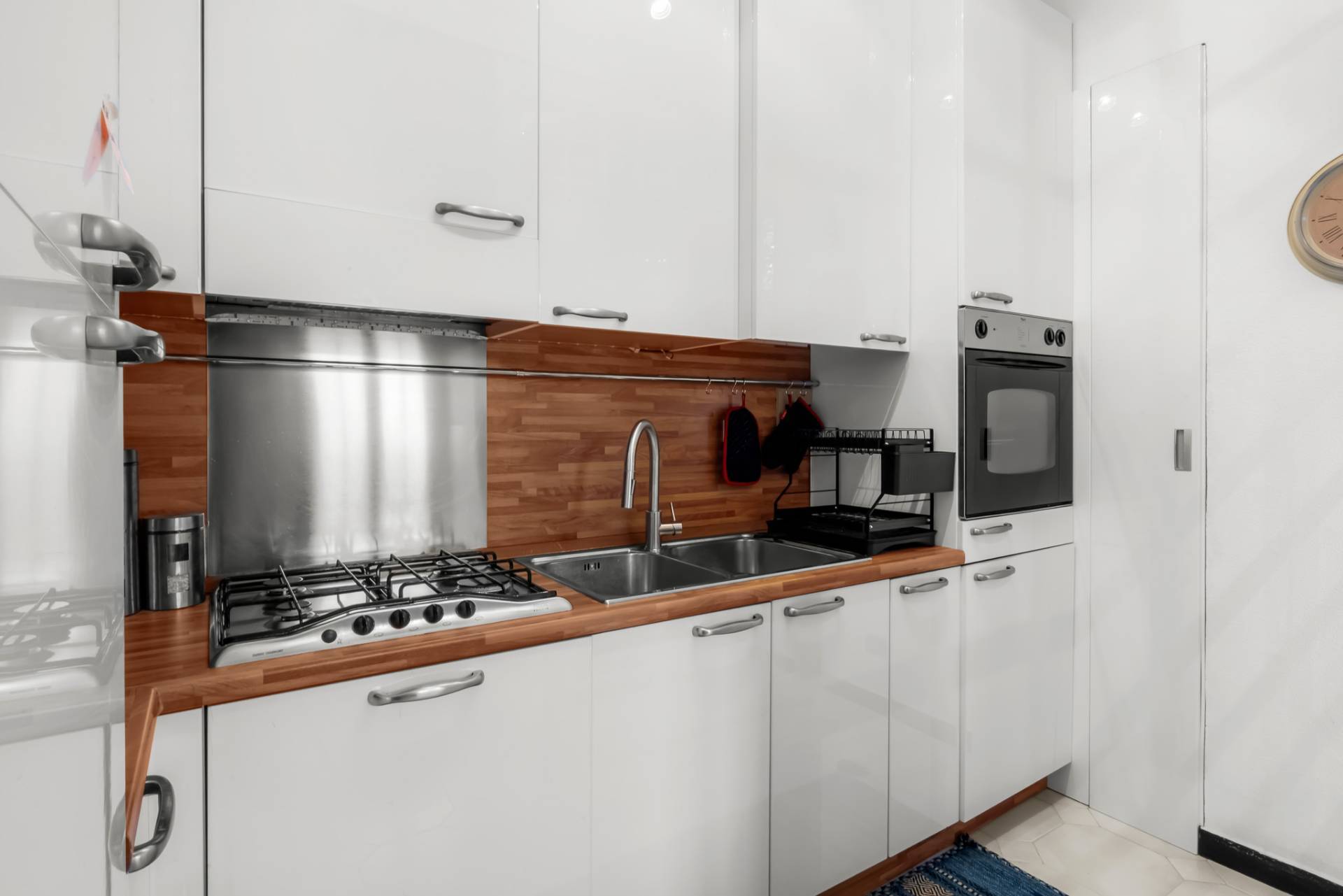 Il cucinino, perfettamente organizzato e a scomparsa, si integra con discrezione nella zona living, mantenendo ordine ed eleganza negli spazi.