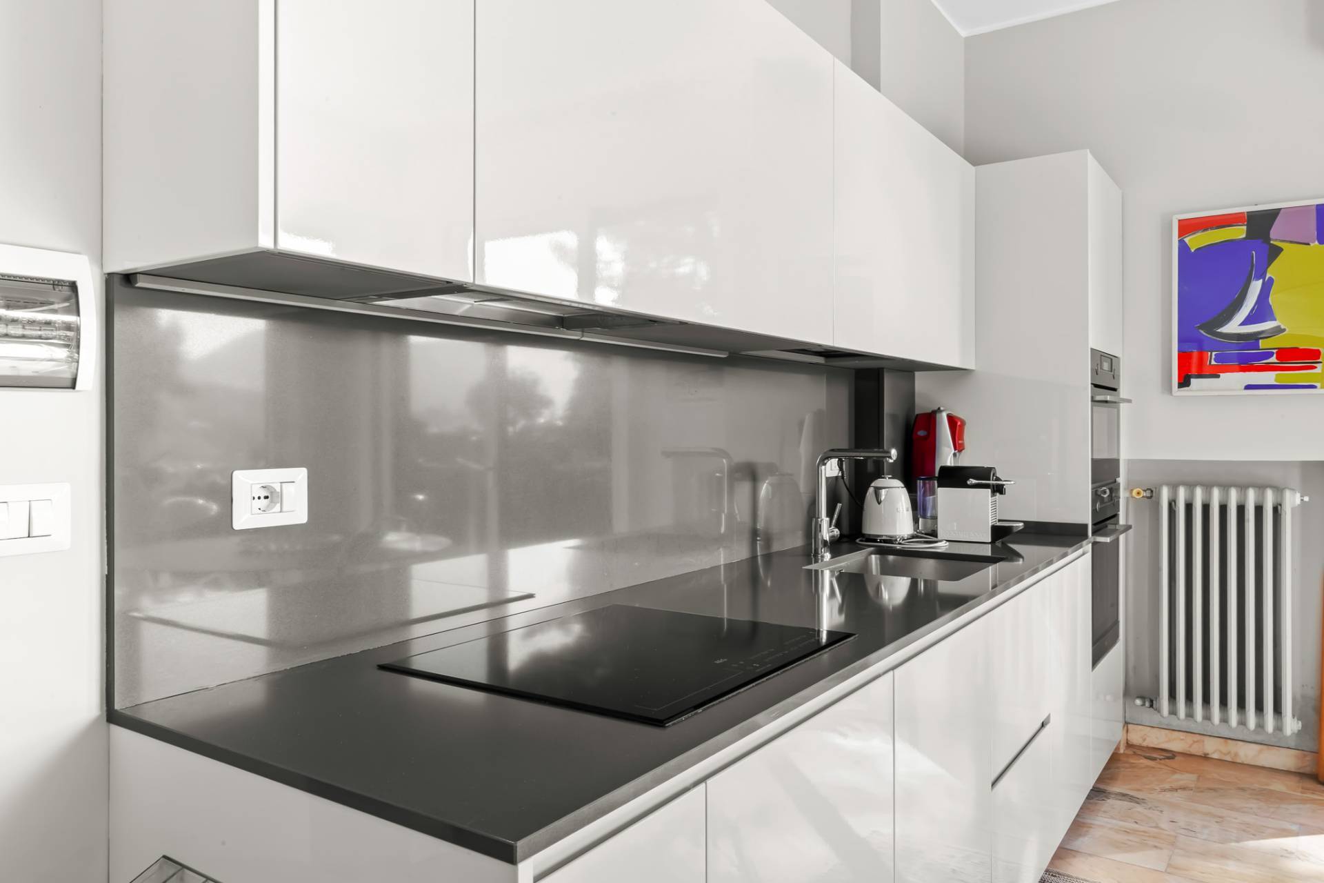 A completare gli interni, un comodo ripostiglio e una zona dedicata con armadiatura su misura, perfettamente integrata, allinterno della quale stato ricavato uno spazio funzionale per lavatrice e asciugatrice, pensato per ottimizzare lorganizzazione domestica senza rinunciare allestetica.