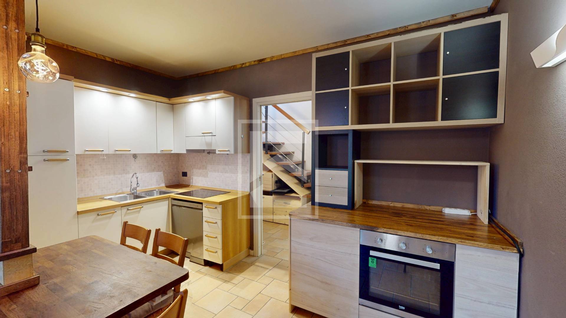 Il portoncino blindato si apre sulla zona giorno dove troviamo un ulteriore accesso alla loggia e l'ampio e funzionale angolo cucina con penisola.