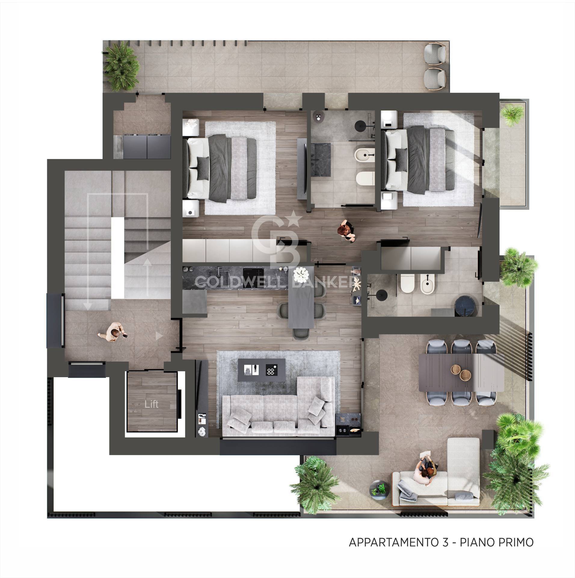 Gli spazi esterni comprendono una loggia di 9 mq, un terrazzo di 5 mq e balconi per un totale di 22,23 mq, perfetti per vivere all'aperto in piena tranquillit.