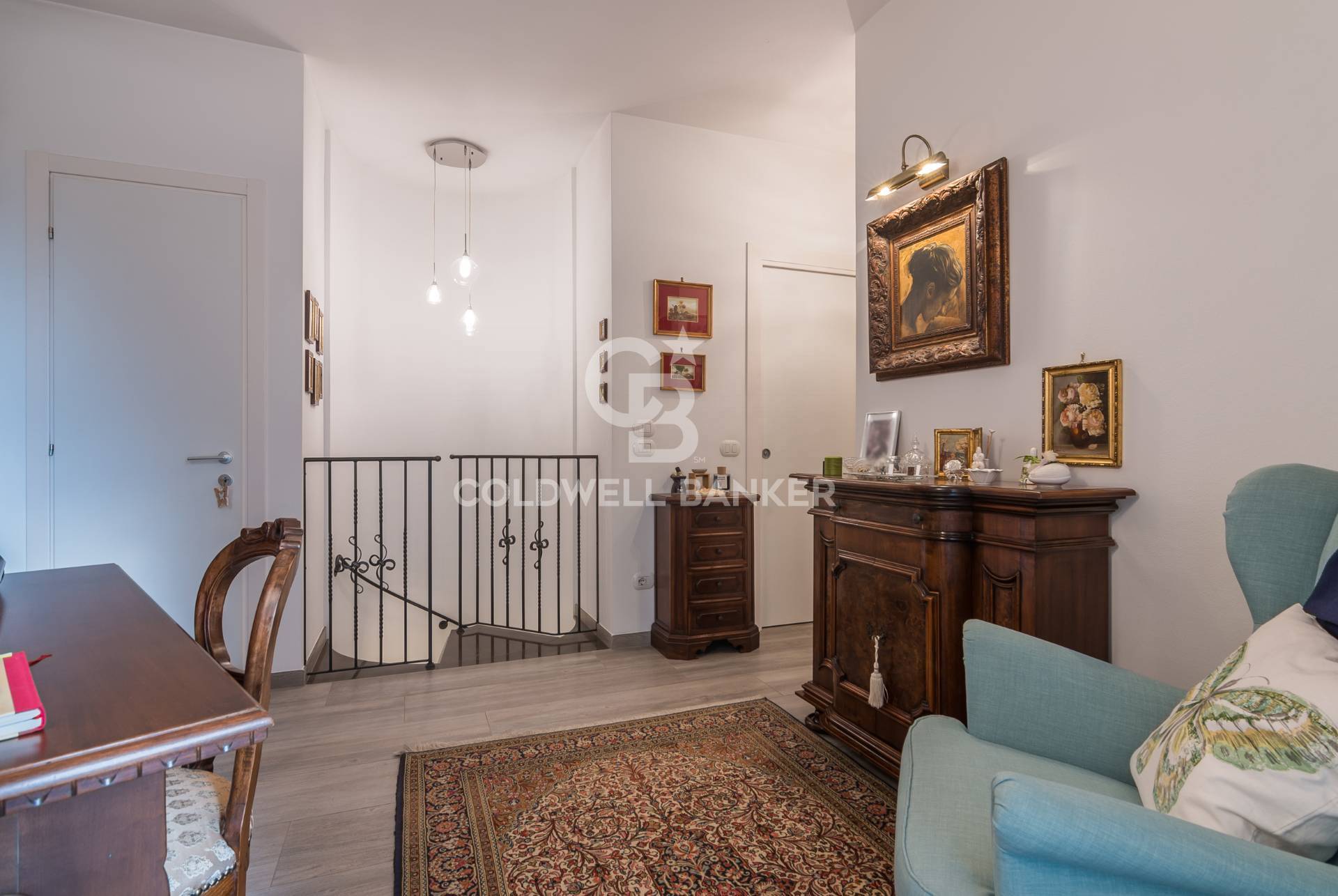 Una scala a chiocciola conduce al secondo livello, dove si apre un ampio salottino dal taglio signorile che introduce alla zona notte, composta da una camera matrimoniale con bagno en suite.
