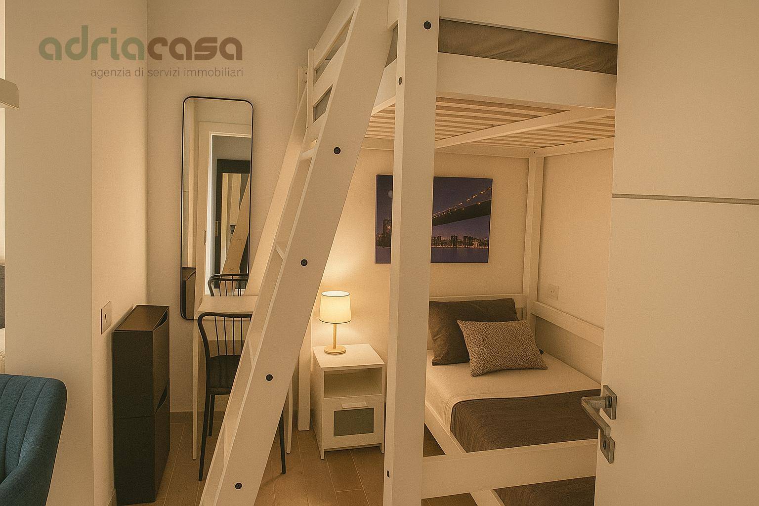 L'ingresso indipendente conduce a un ampio soggiorno, una cucina ben organizzata, una spaziosa camera matrimoniale, una cameretta con letto a castello e doppi servizi.