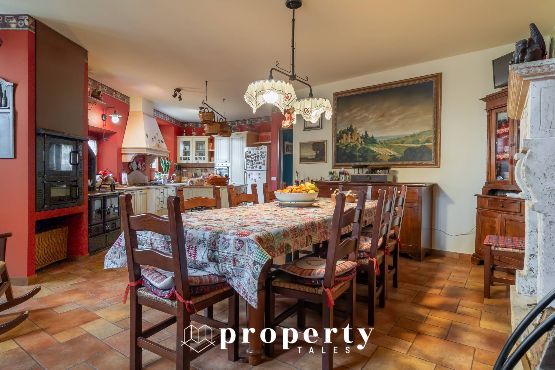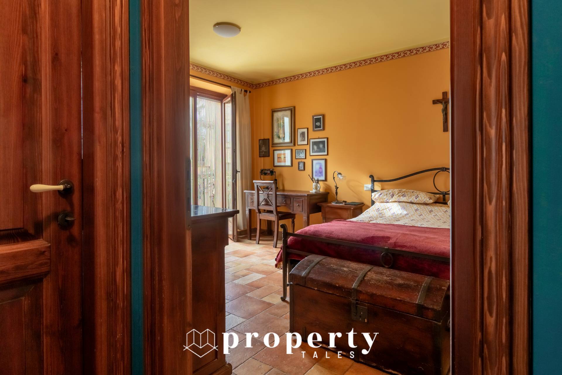 Al primo livello si accede a un soggiorno accogliente con camino antico bifacciale (soggiorno/cucina) e affreschi depoca, ideale per momenti di relax in unatmosfera raffinata.