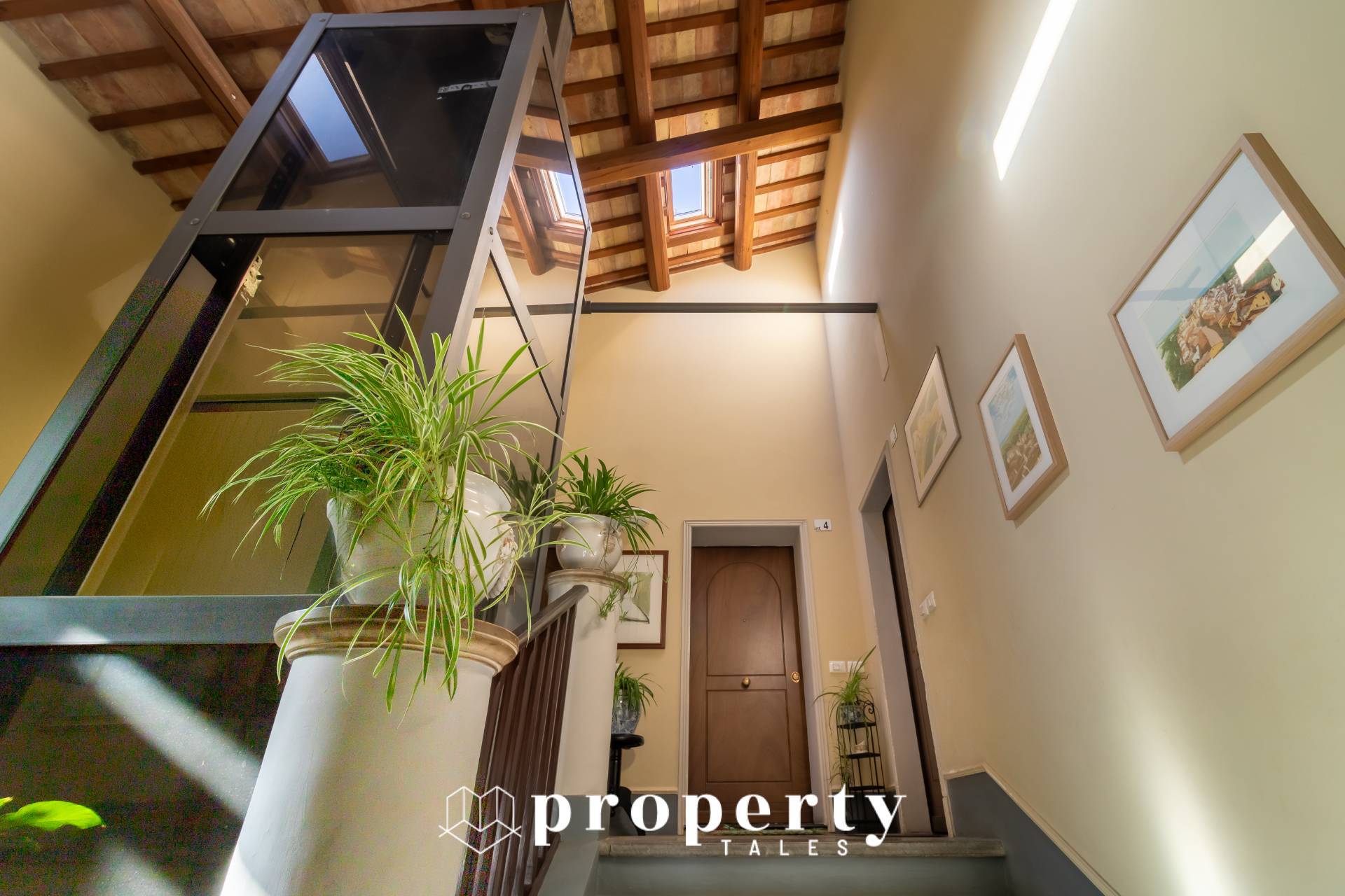 Unelegante scala interna in legno massello, realizzata su misura, conduce al secondo livello, dove si trovano: uno studio, un bagno con ampia doccia e sanitari sospesi, due camere da letto, due terrazzi con vista panoramica sul centro storico, e un locale soffitta con caldaia.