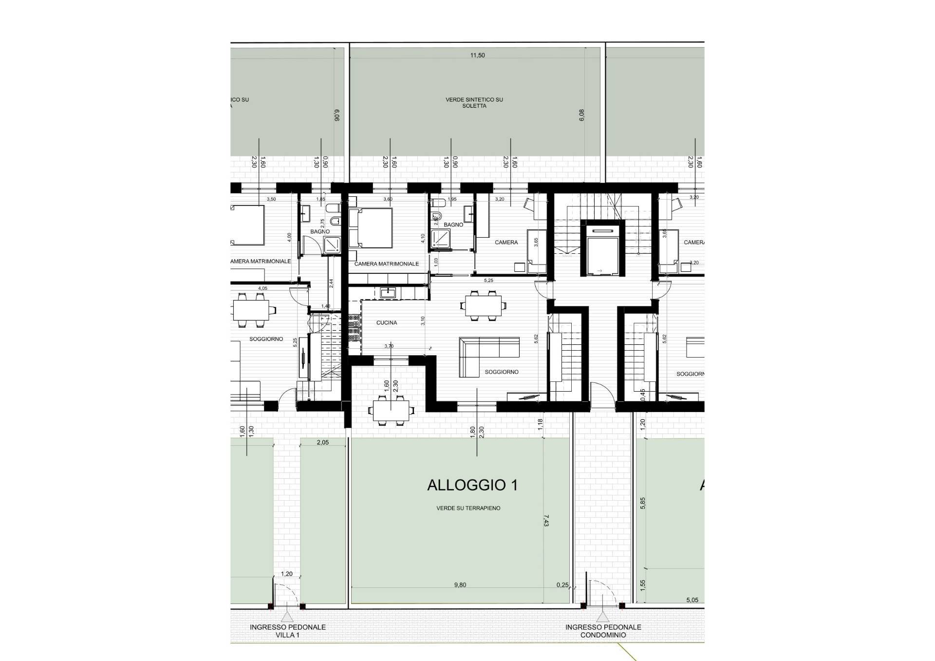 Siamo lieti di proporre la vendita di un intervento residenziale esclusivo che prevede la realizzazione di: - due ville unifamiliari angolari libere su tre lati - quattro appartamenti centrali di cui due al piano terreno con giardino e due al piano primo con ampi terrazzi Ogni unit immobiliare dispone di: - box auto abbinato - possibilit di box doppio - spazi esterni privati (giardini o terrazzi). ALLOGGIO 1 L'appartamento si trova al piano terreno ed dotato di un giardino di mq 125 circa oltre all'area pavimentata di mq 32 circa comprensiva di loggiato.