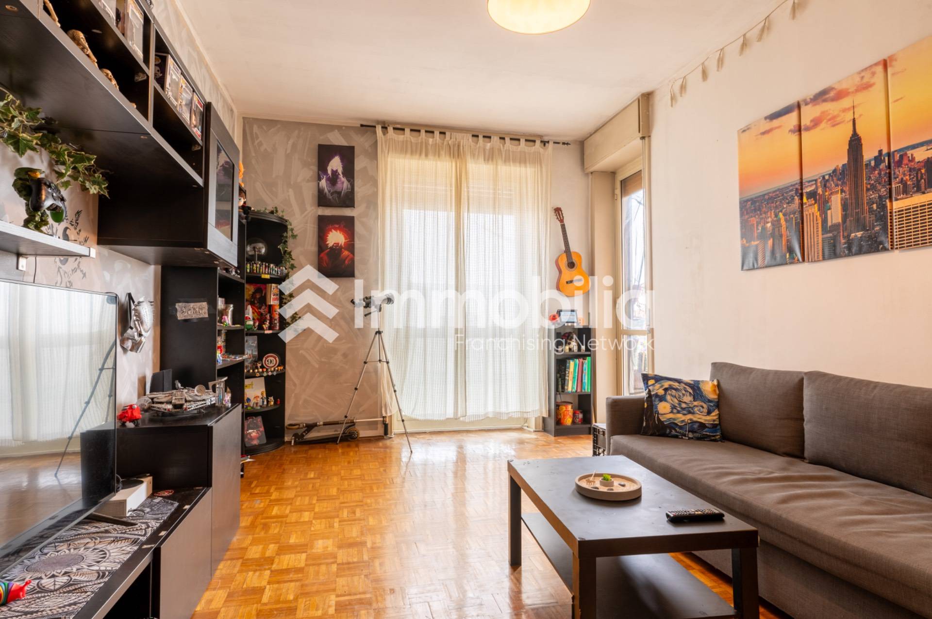 Lingresso conduce su un ampio disimpegno che accompagna alla zona giorno composta da soggiorno luminoso, caratterizzato da grandi superfici finestrate e accesso al balcone, e da una cucina separata e abitabile, pratica e ben organizzata.