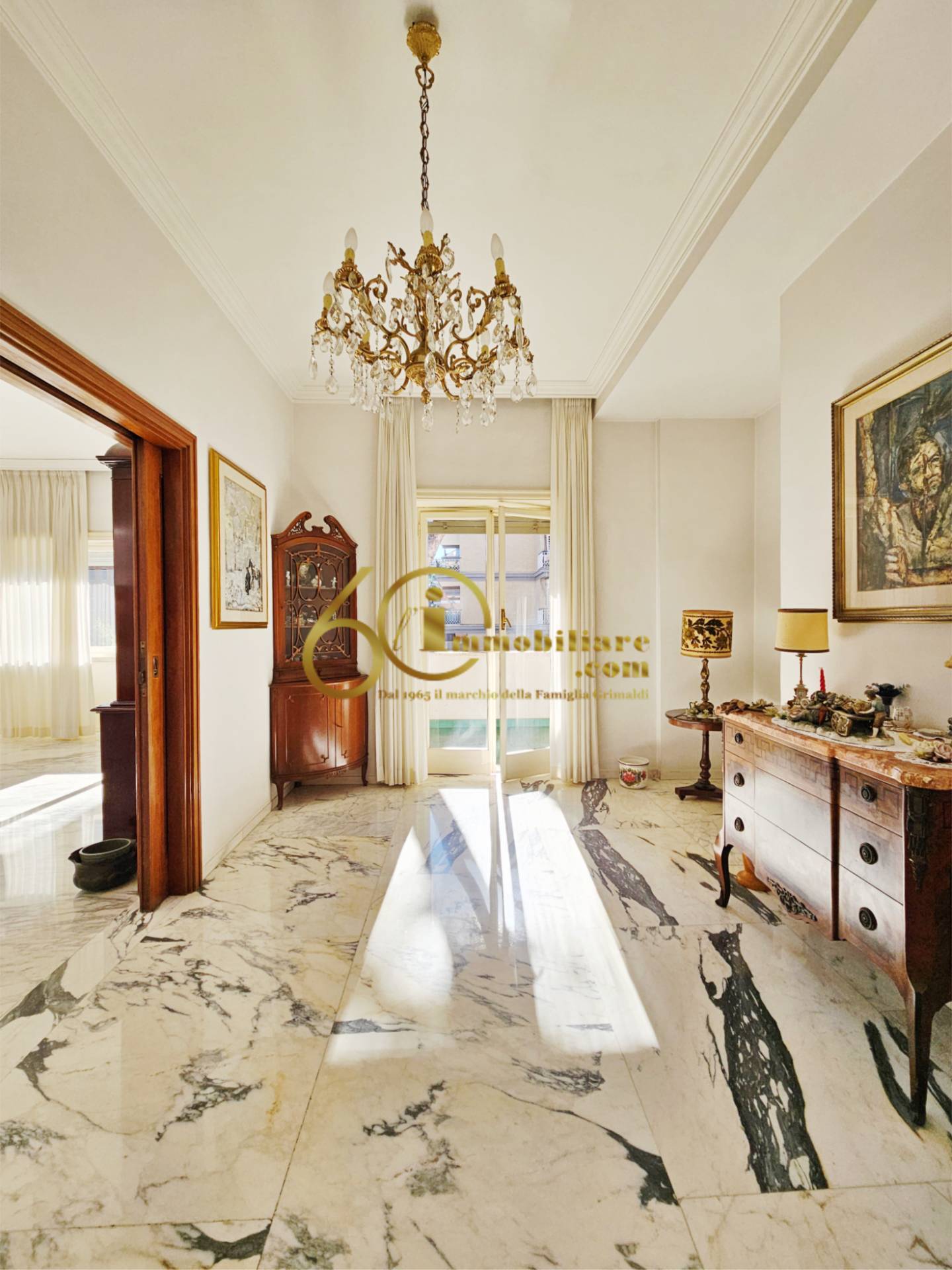 Gli ambienti sono cos distribuiti: doppia entrata al piano (principale e di servizio). Principale: ampio ingresso con balcone, salone doppio con terrazza a livello e caminetto, disimpegno che collega alla zona servizi, corridoio, disimpegno, 4 camere (di cui due con balcone), due servizi.