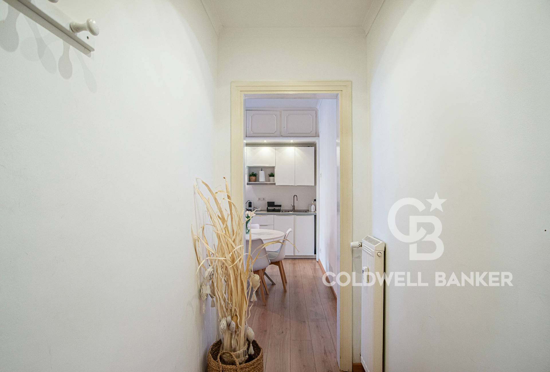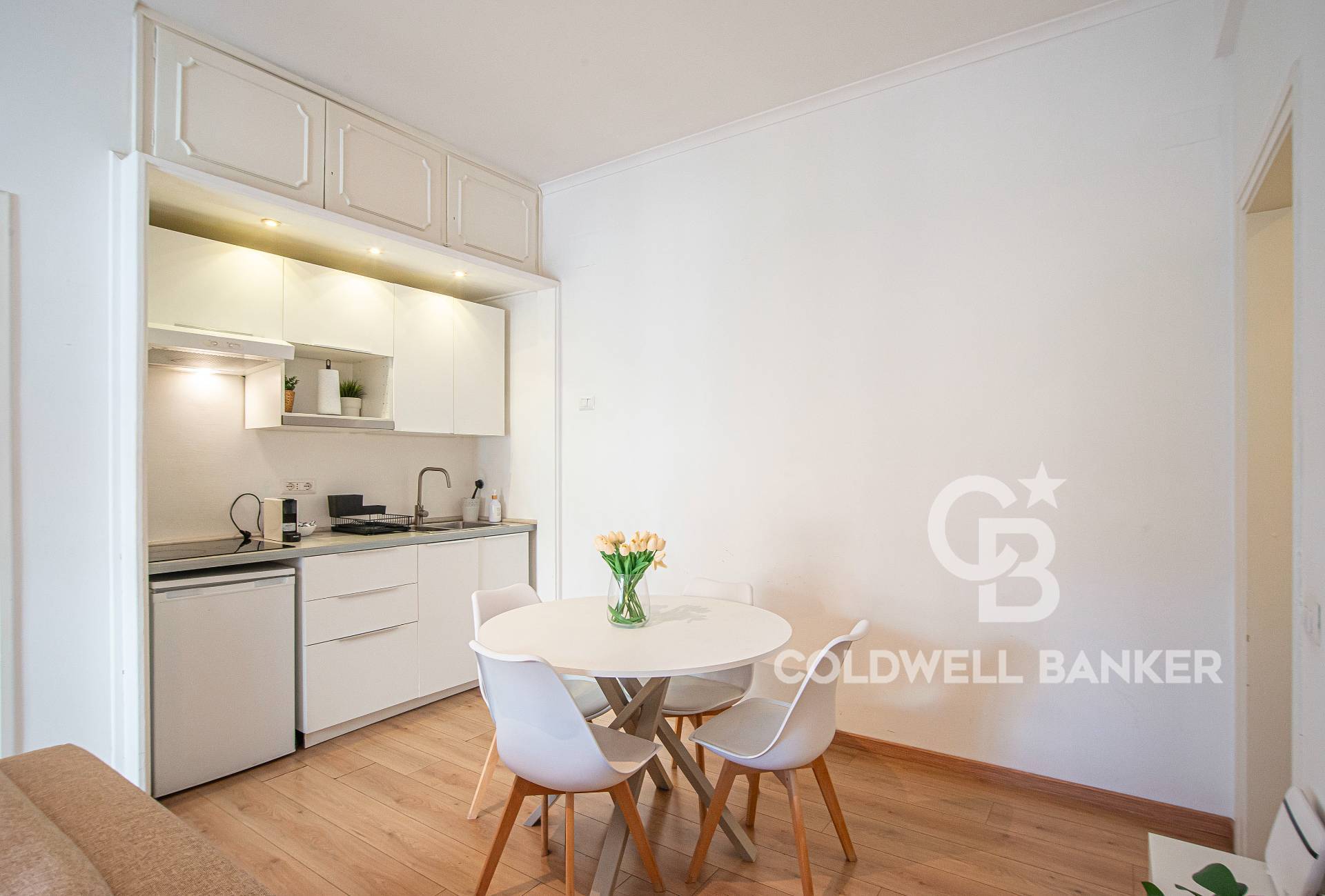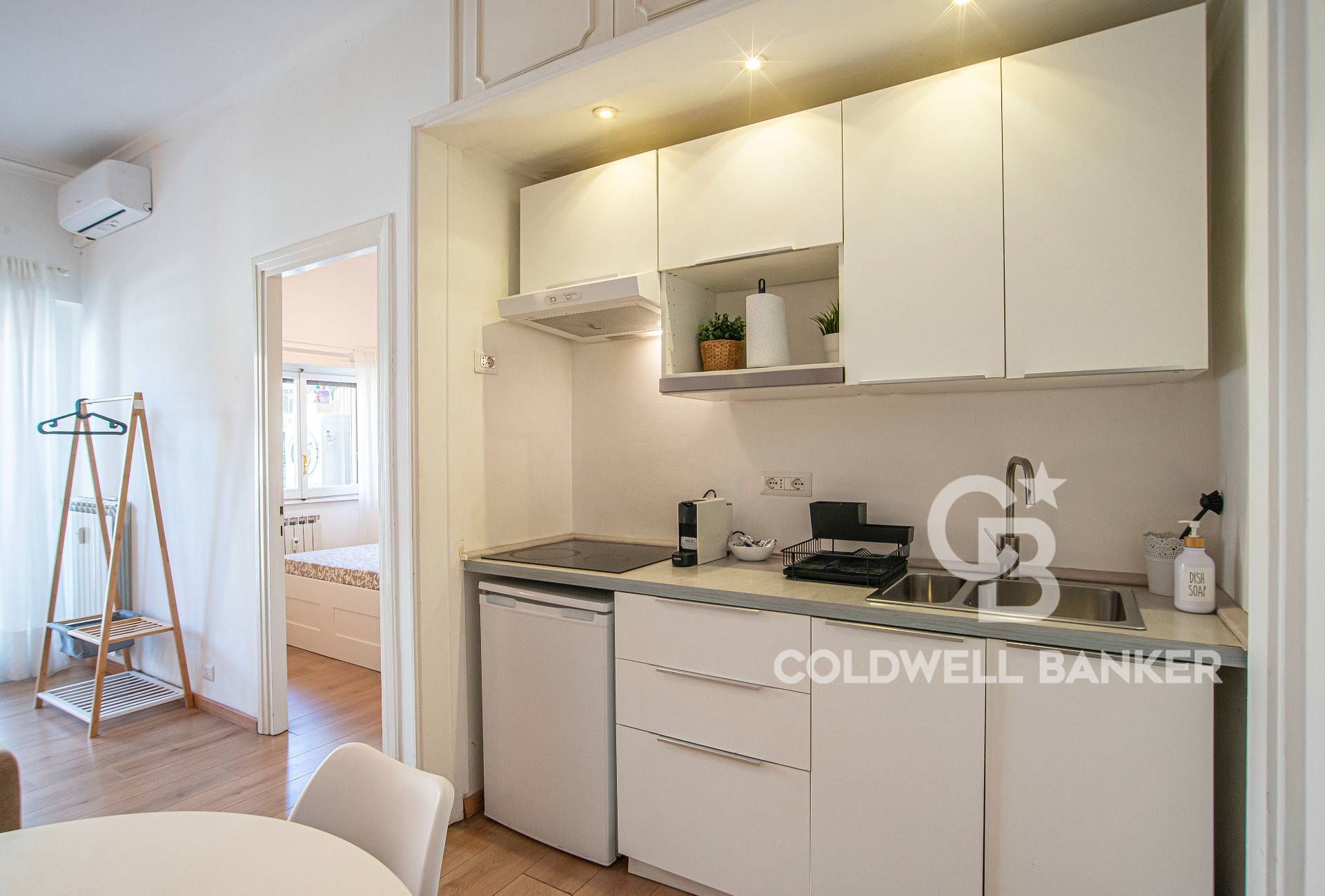 Lingresso introduce in un ambiente accogliente che si apre su un angolo cottura moderno, completo di tutti gli elettrodomestici, perfettamente integrato nella zona giorno.