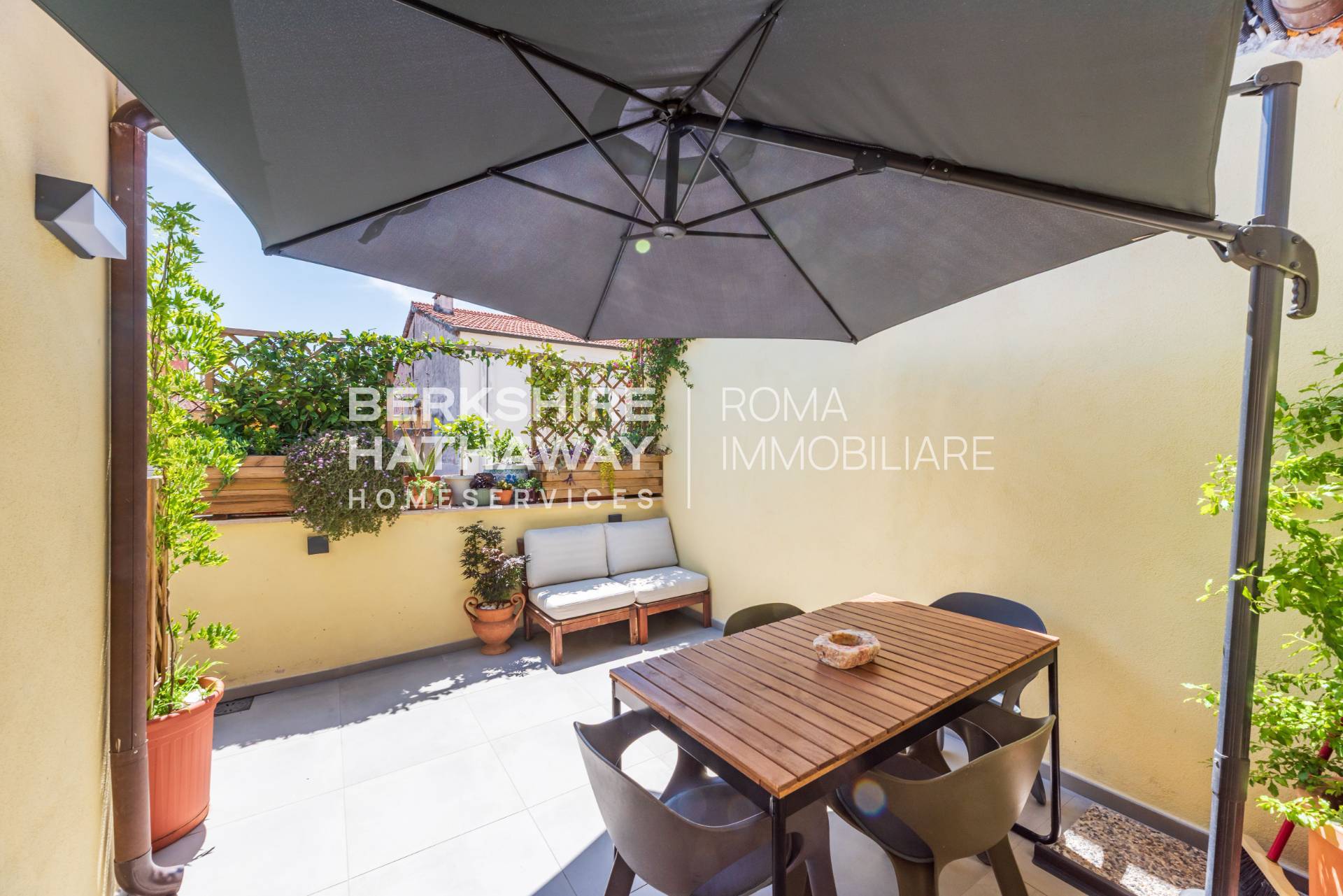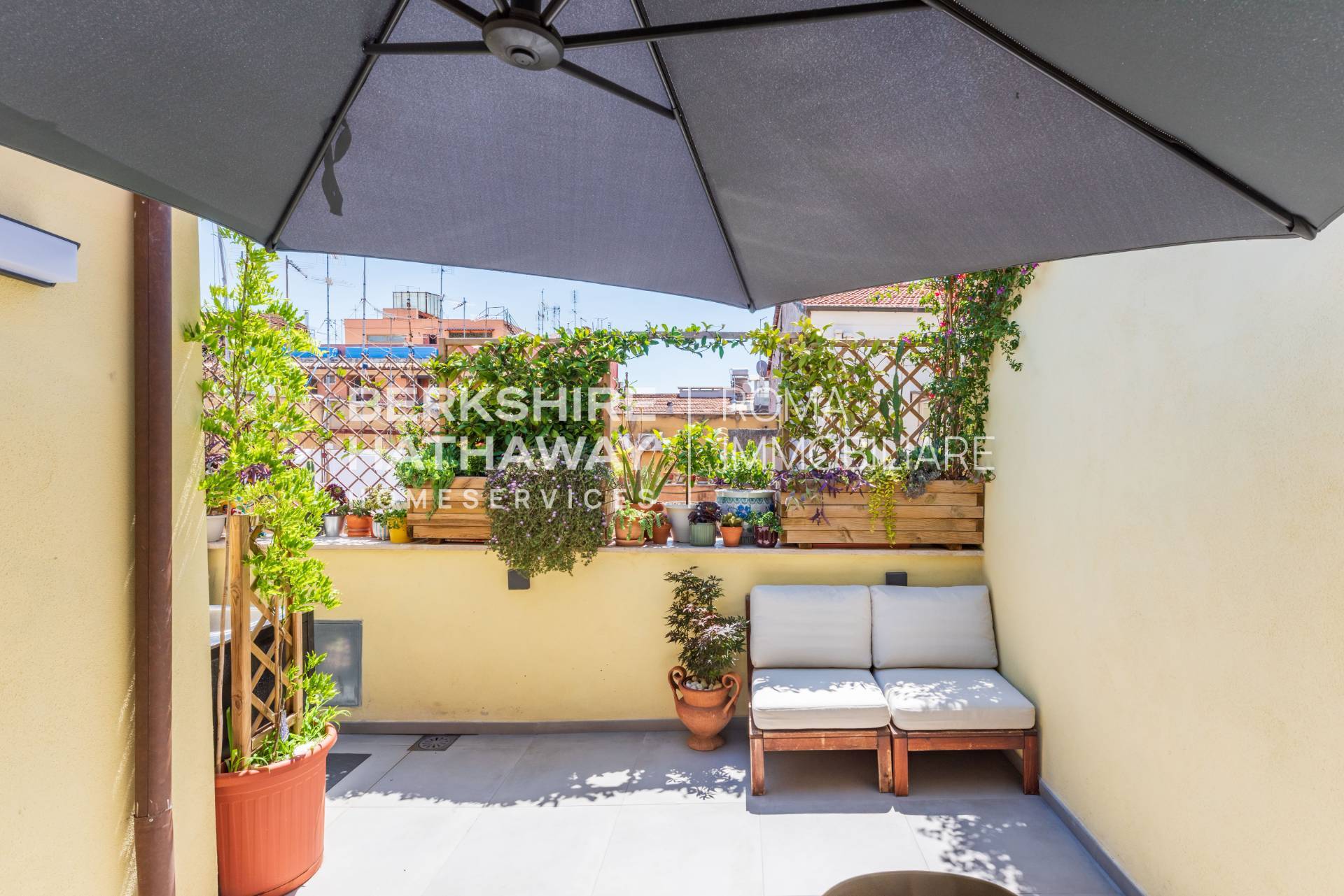 Una scala interna in Gress e legno di castagno collega il secondo livello'?Il secondo livello una vera oasi di pace: una magnifica suite padronale ( 21 mq ) con bagno privato e un terrazzo a livello, attrezzato con cucina esterna per godere di momenti di relax e di una vista sui tetti della capitale.