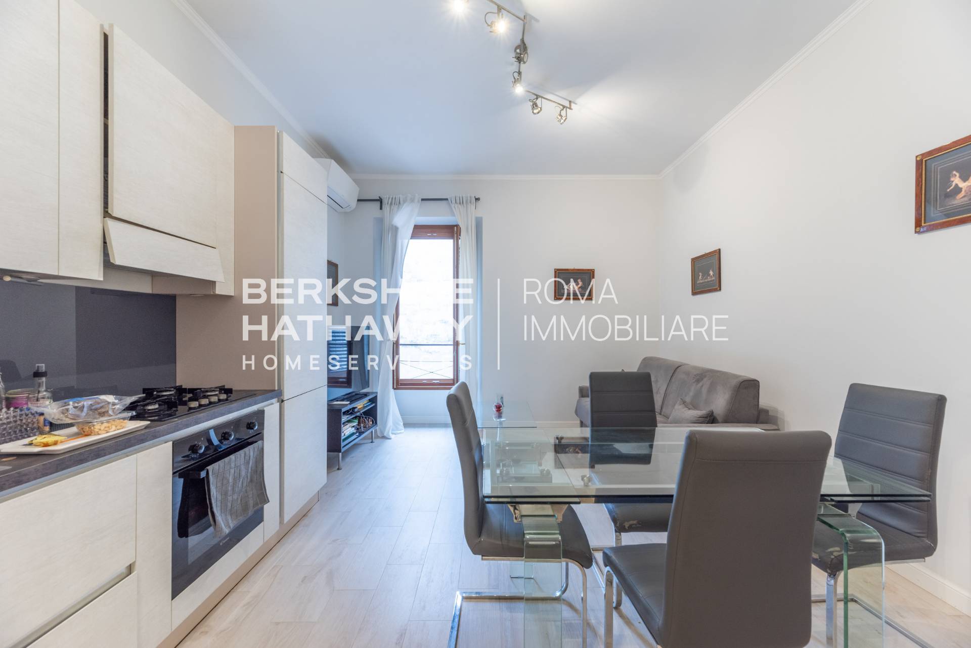 Lingresso conduce ad un ampio e raffinato living con cucina a vista, perfetto per momenti di convivialit o relax.