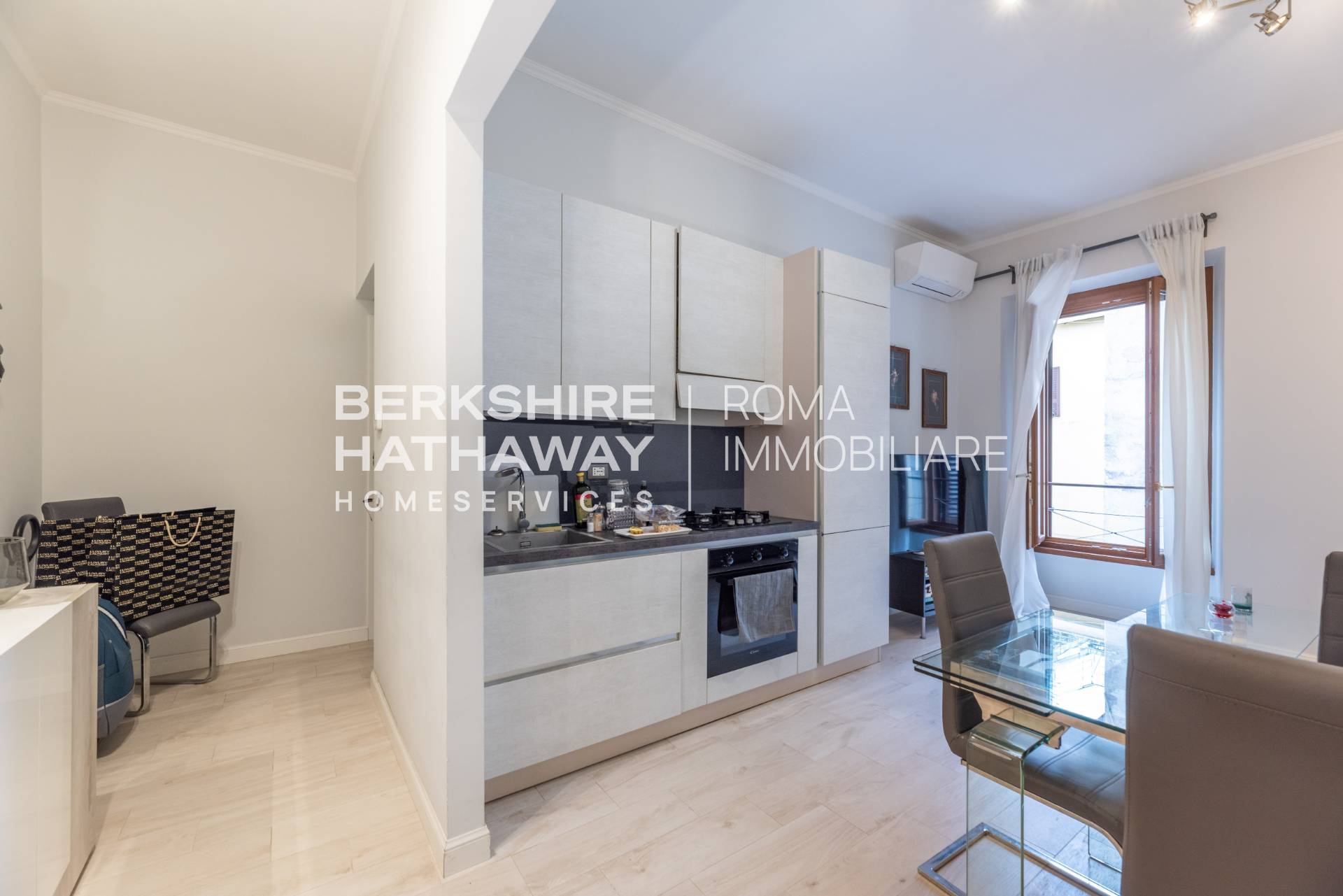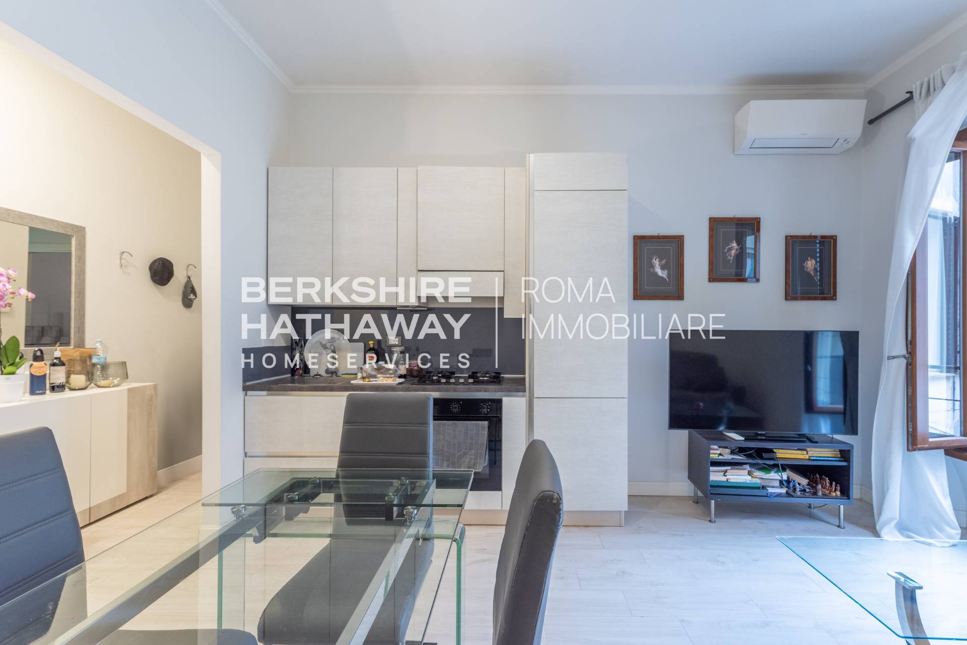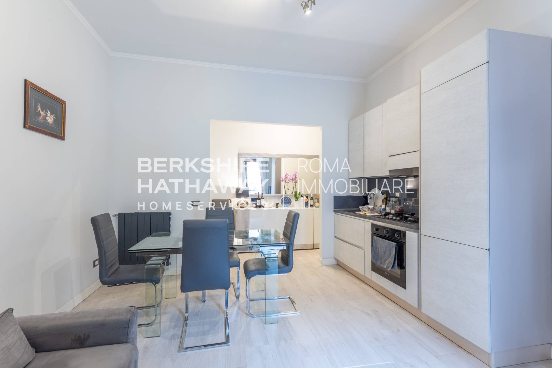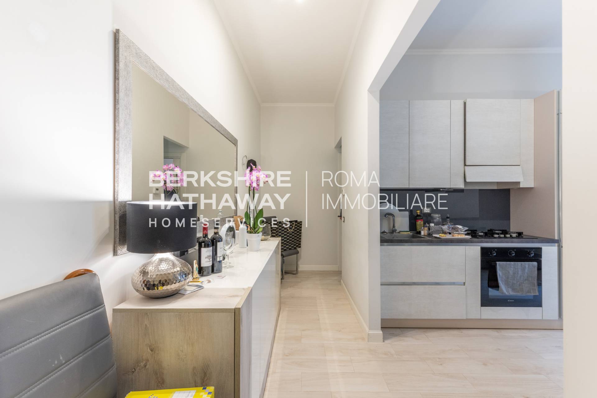 Lingresso conduce ad un ampio e raffinato living con cucina a vista, perfetto per momenti di convivialit o relax.