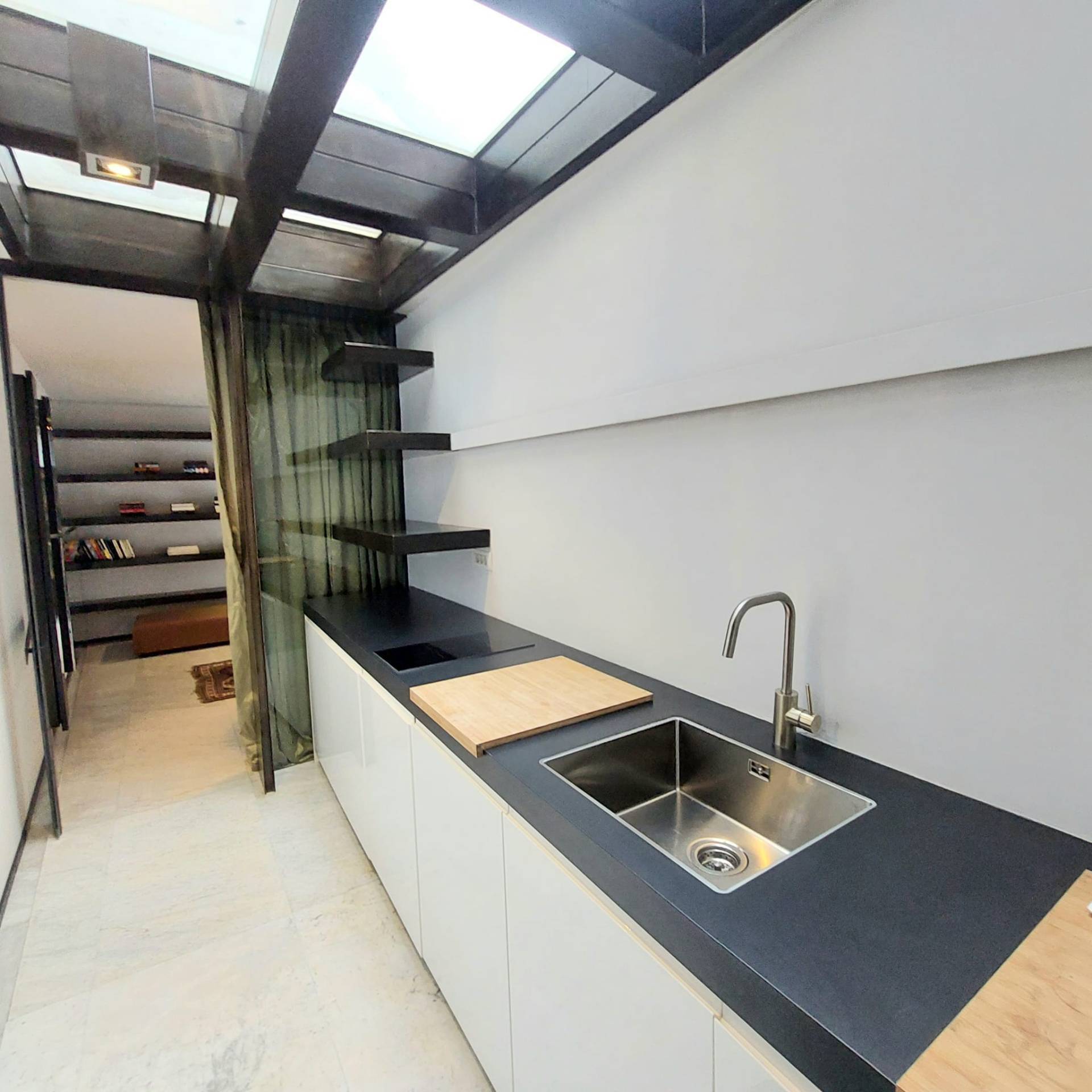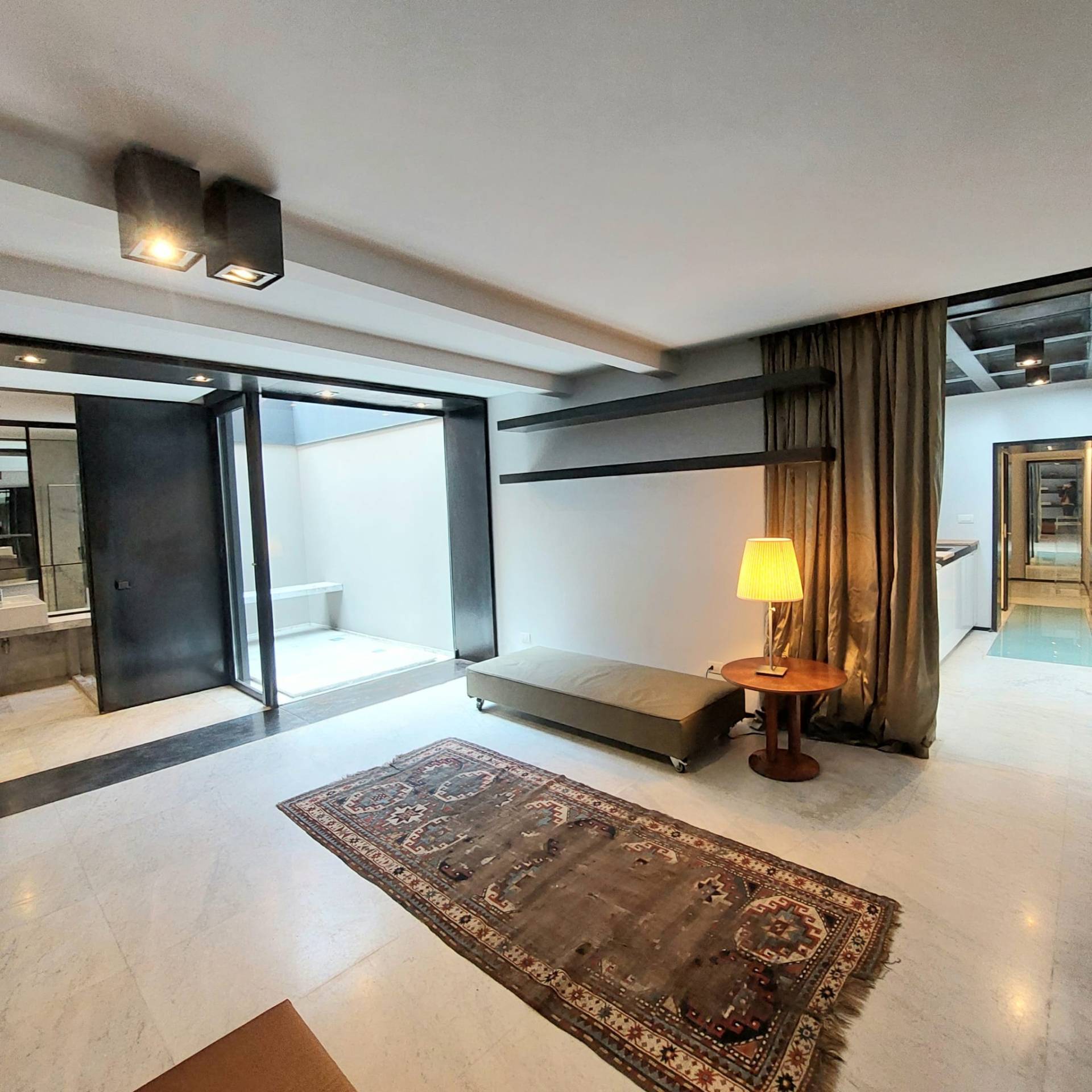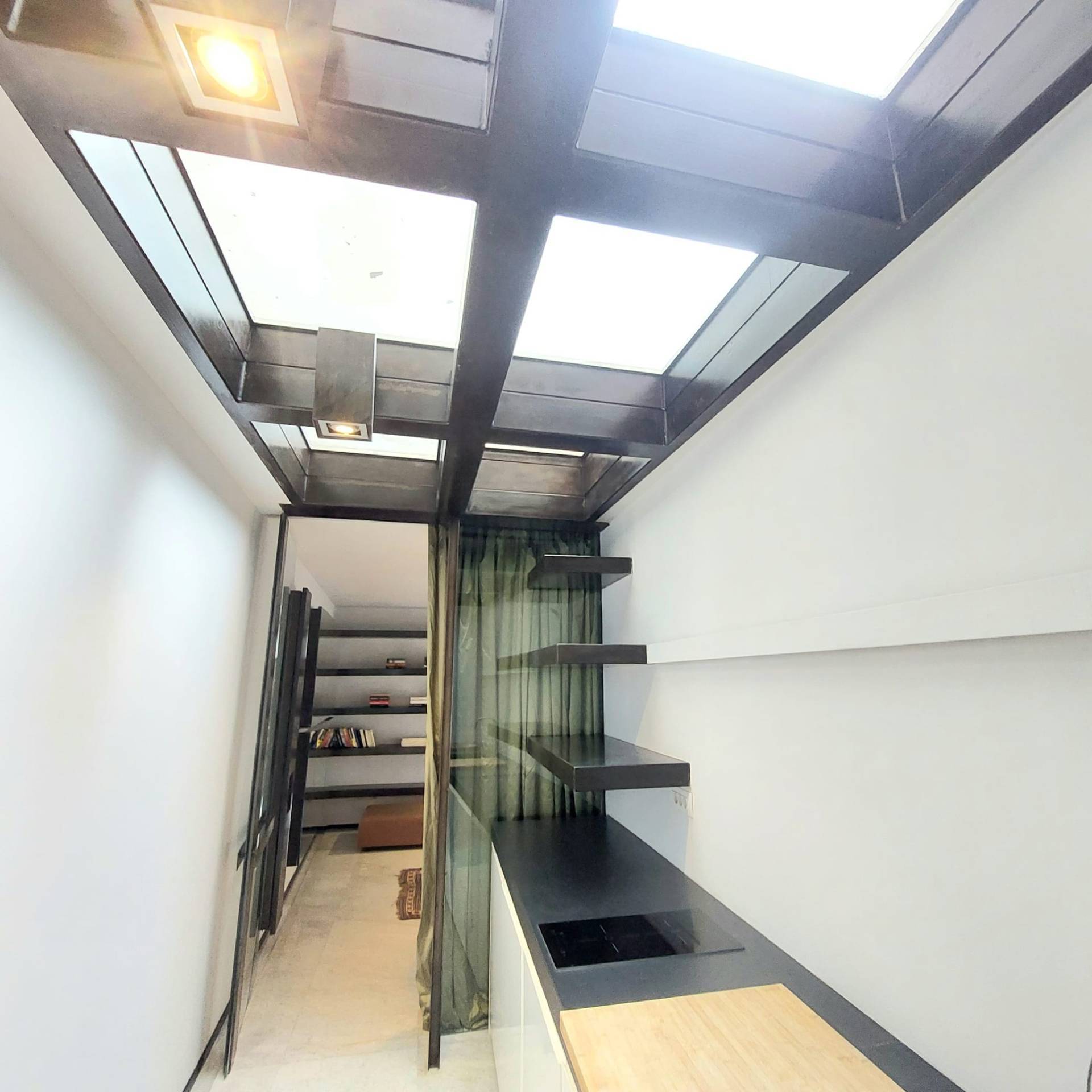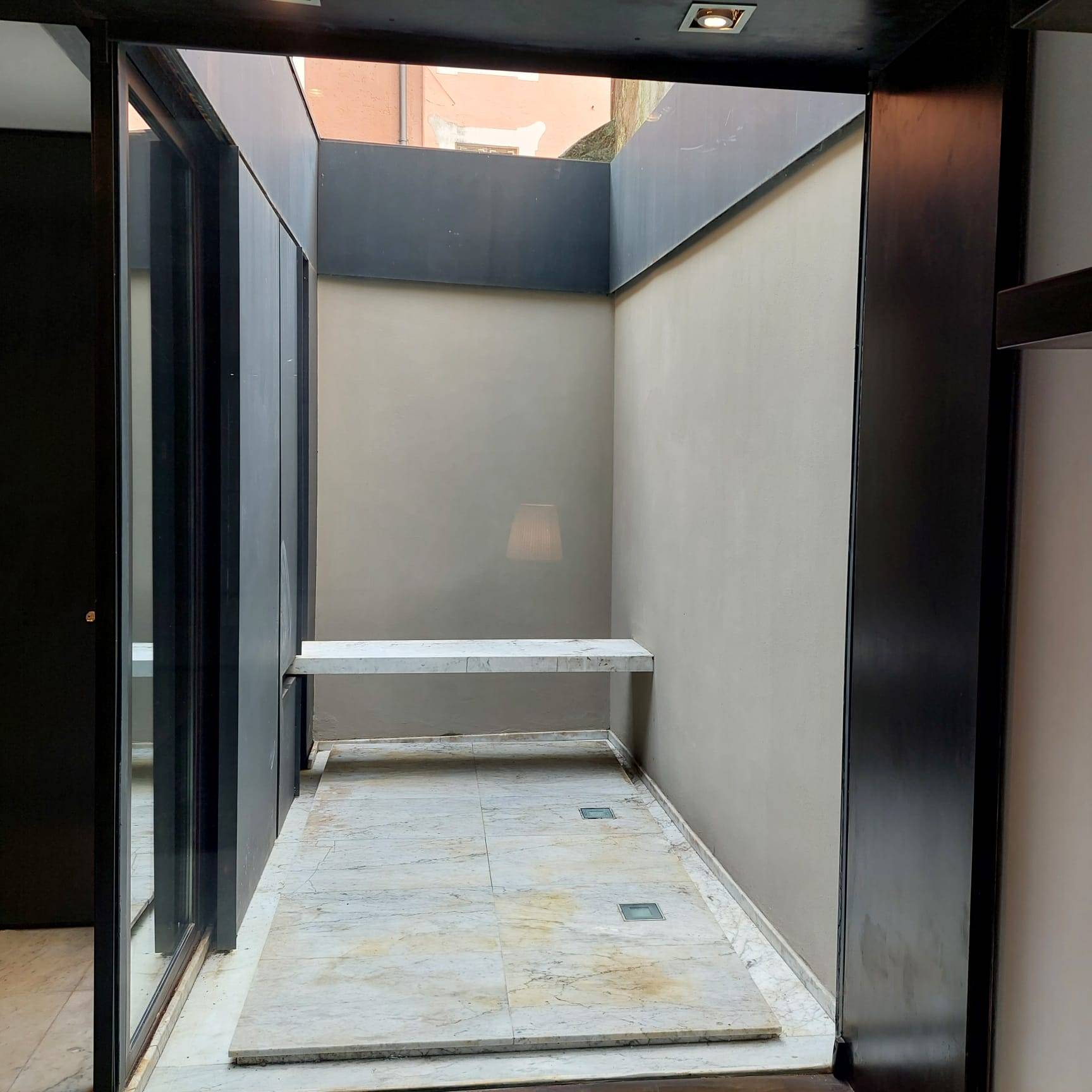 Dallingresso si accede, tramite un comodo spazio longitudinale sapientemente sfruttato con una parete attrezzata uso cucina di design, ad un'unica zona living, molto particolare, di grande fascino con affaccio su una chiostrina privata.