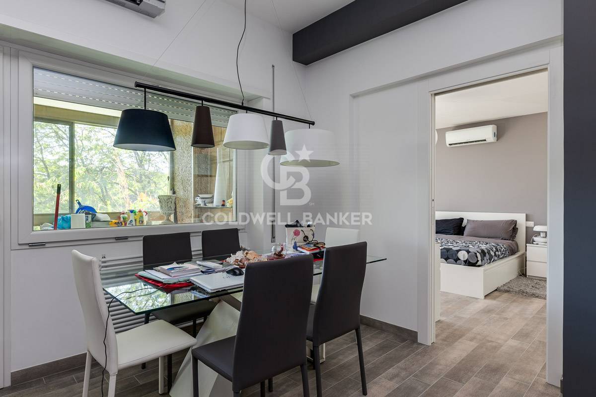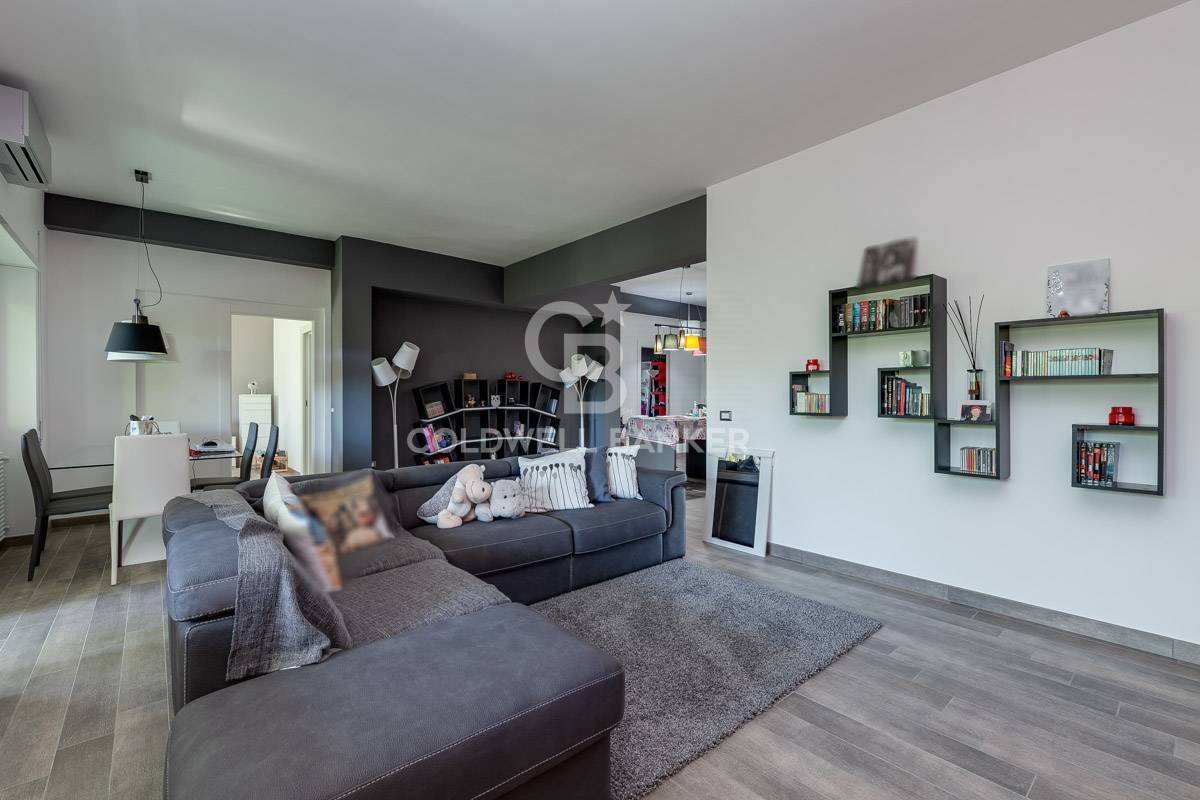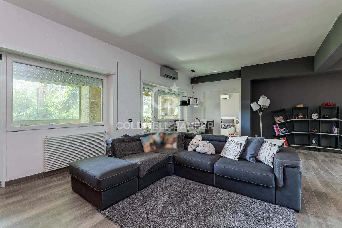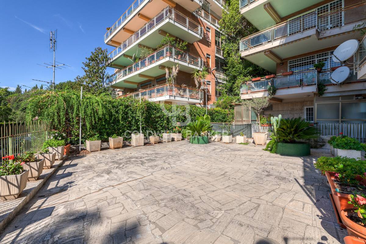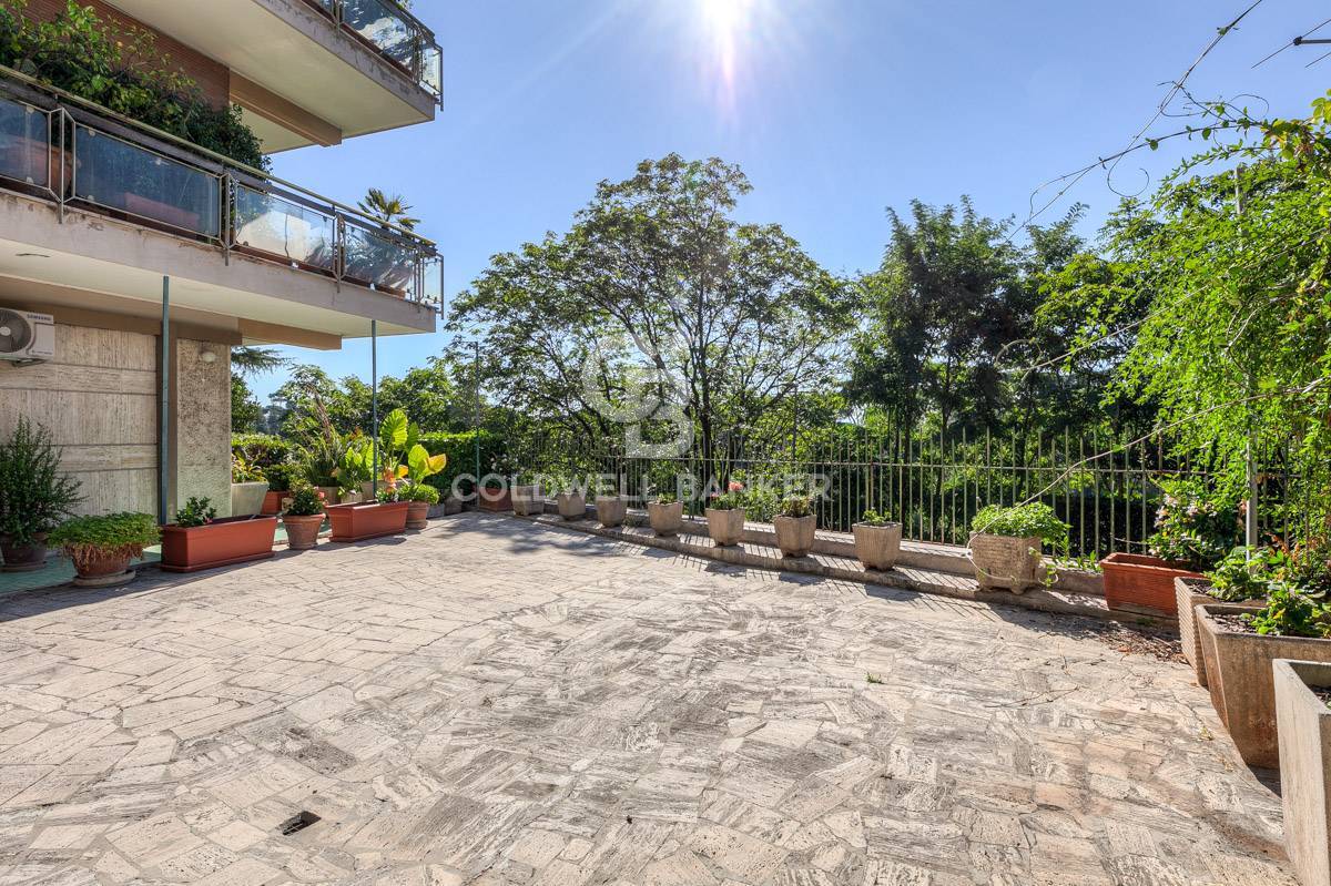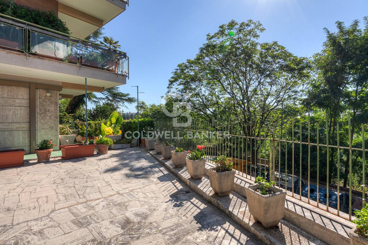 L'immobile ha doppio ingresso ed cos composto: salone doppio con cucina a vista "all'americana" completamente arredata ed equipaggiata, tre camere da letto, tripli servizi, due terrazzi e uno splendido giardino in parte pavimentato di circa 300 mq. Completa la propriet una cantina ed un box auto. L'appartamento stato oggetto di una ristrutturazione totale, porta di ingresso blindata, aria coindizionata, riscaldamento autonomo, infissi doppio vetro taglio termico, grate di sicurezza alle finestre.