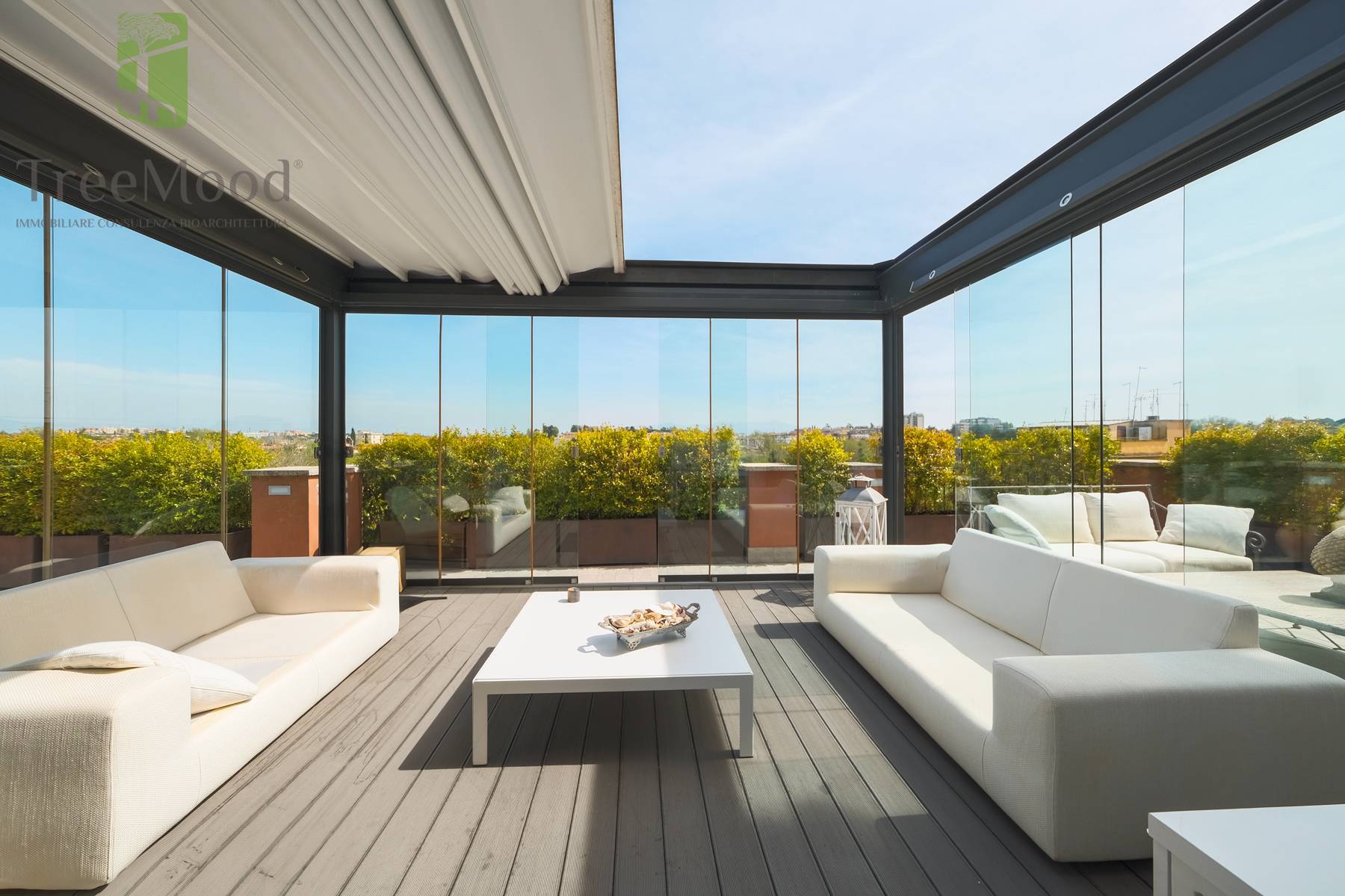 Dal salone della propriet si accede inoltre, attraverso una preziosa scala in marmo e cristallo dotata di una sua splendida finestra, al livello superiore della casa, composto da una terrazza panoramica di ca. 100 mq di copertura del villino, attrezzata con una cucina esterna e barbecue con zona pranzo e dotata di una zona salone scoperta e di una zona salone coperta grazie alla recente realizzazione di una struttura con vetrate a pacchetto coperta con una pergotenda elettrica, che ne consentono luso anche durante i mesi invernali.