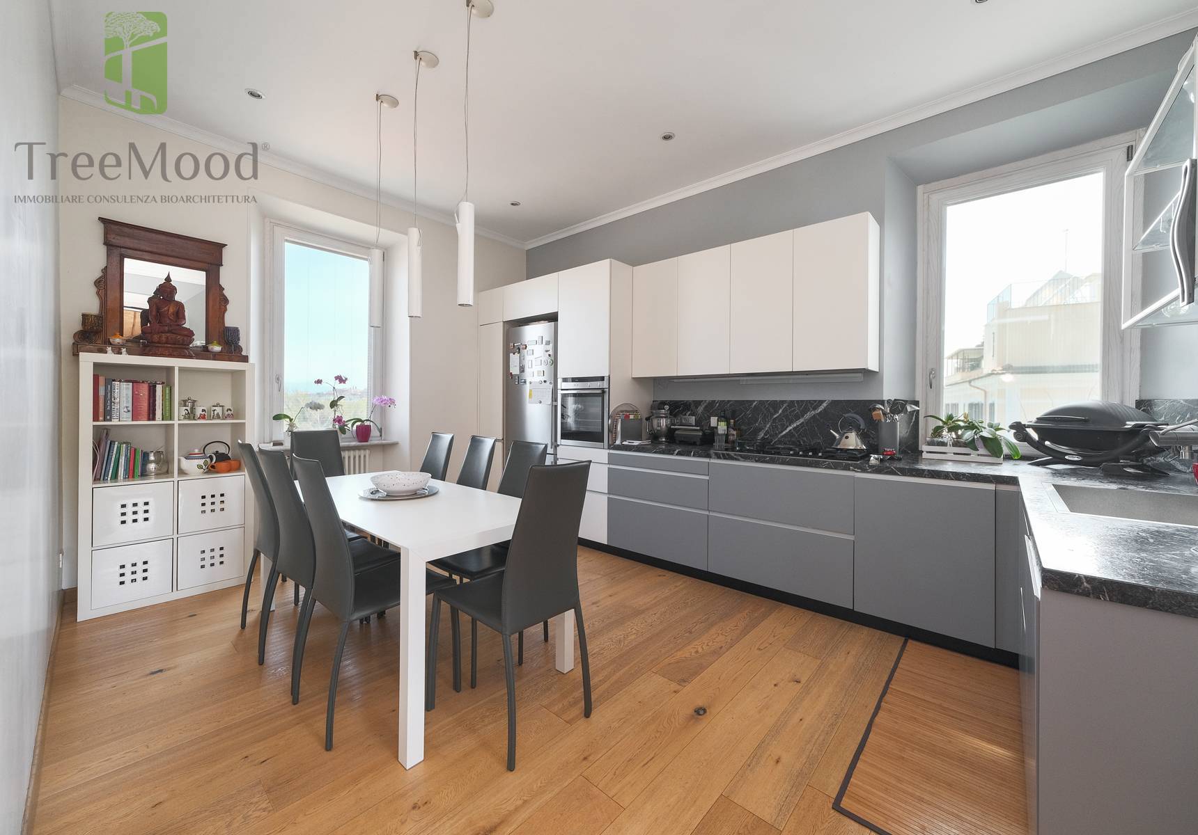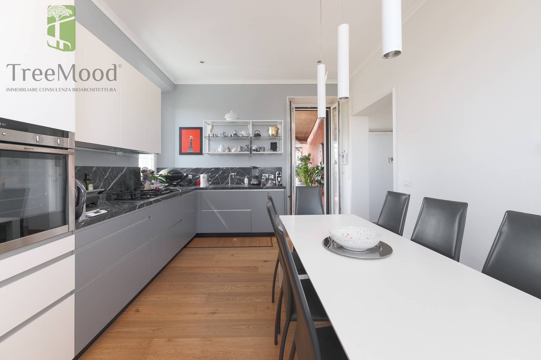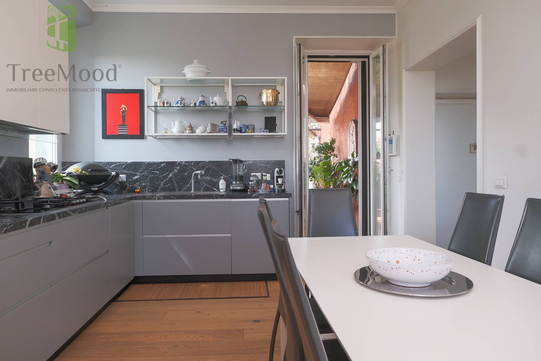 Lappartamento gode di una quadrupla esposizione esterna e si affaccia attraverso due meravigliose terrazze e attraverso numerose ed ampie finestre sul verde circostante.