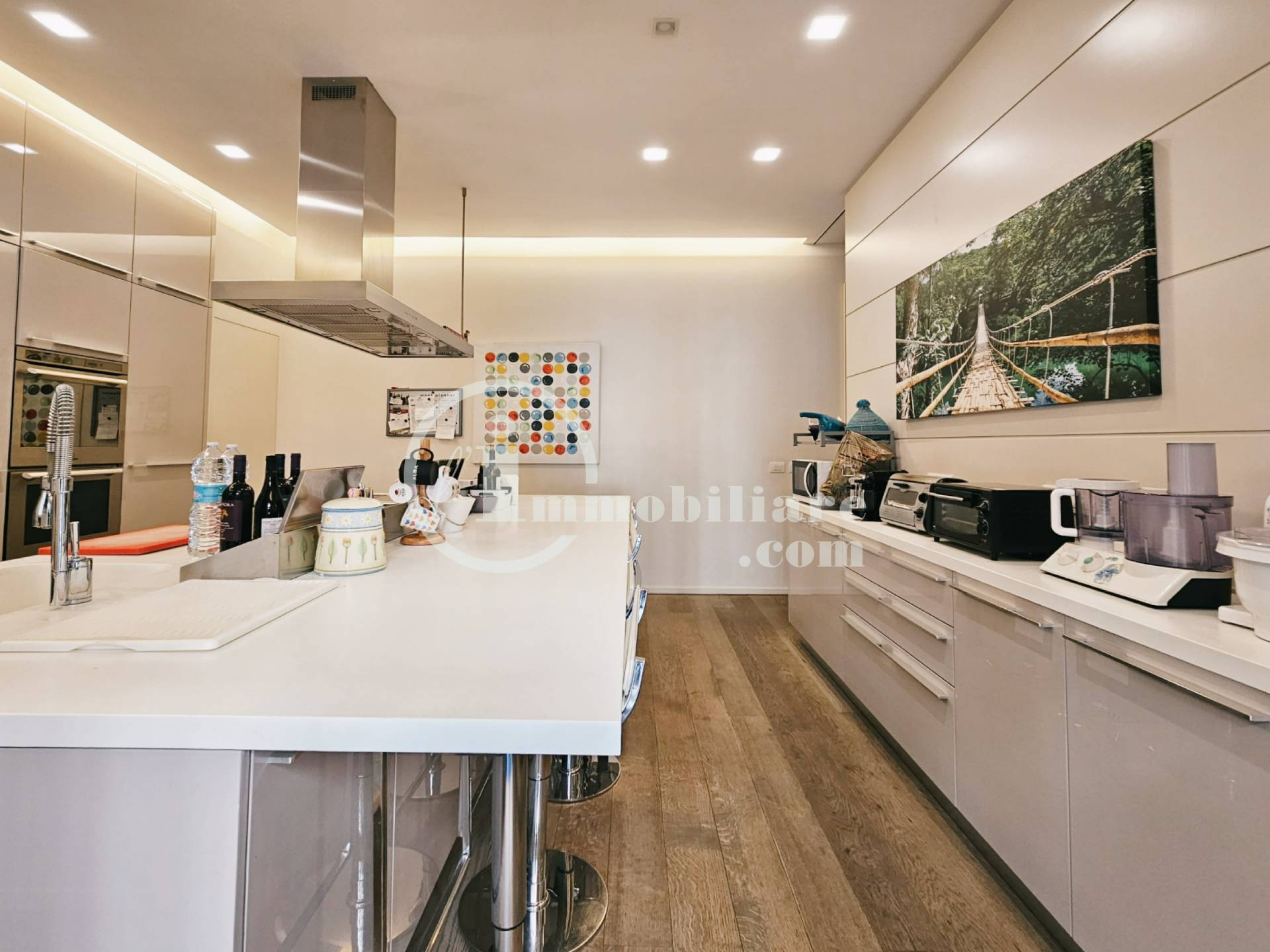 La pianta della casa segue il curvo perimetro circolare/angolare dello stabile con una tripla esposizione Nord/Ovest/Est: sul lato destro del corridoio centrale dingresso troviamo il salone doppio, sala da pranzo, sala TV - o stanza ospiti - con parete mobile modulare, unampia cucina allamericana con isola centrale, zona servizi e lavanderia, balcone e la grande terrazza a livello con zona barbecue e salotto.
