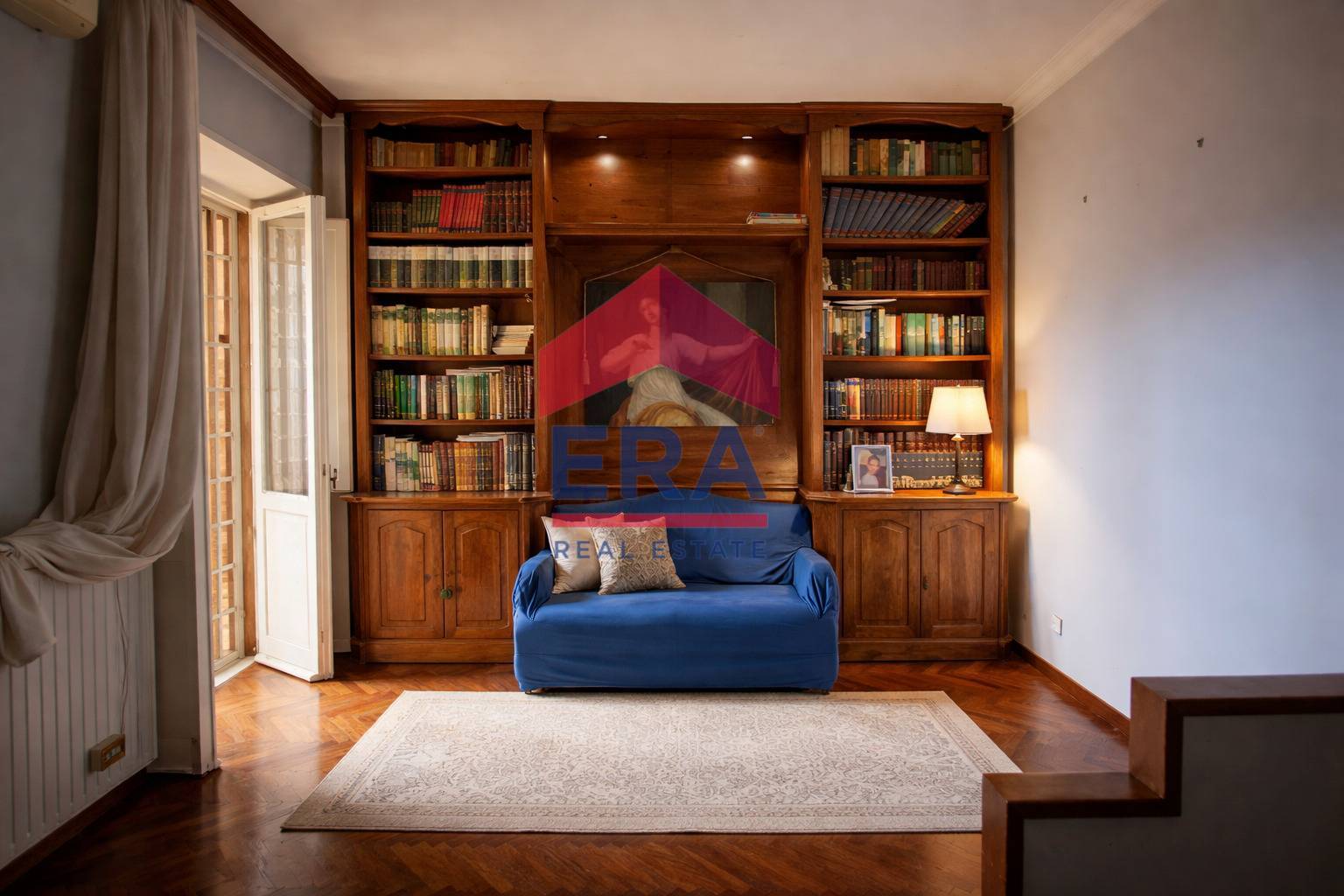 Qui trova spazio un esclusivo ambiente studio, impreziosito da una libreria a muro in legno massello e illuminato da luce naturale, ideale come studio privato o raffinato angolo lettura.