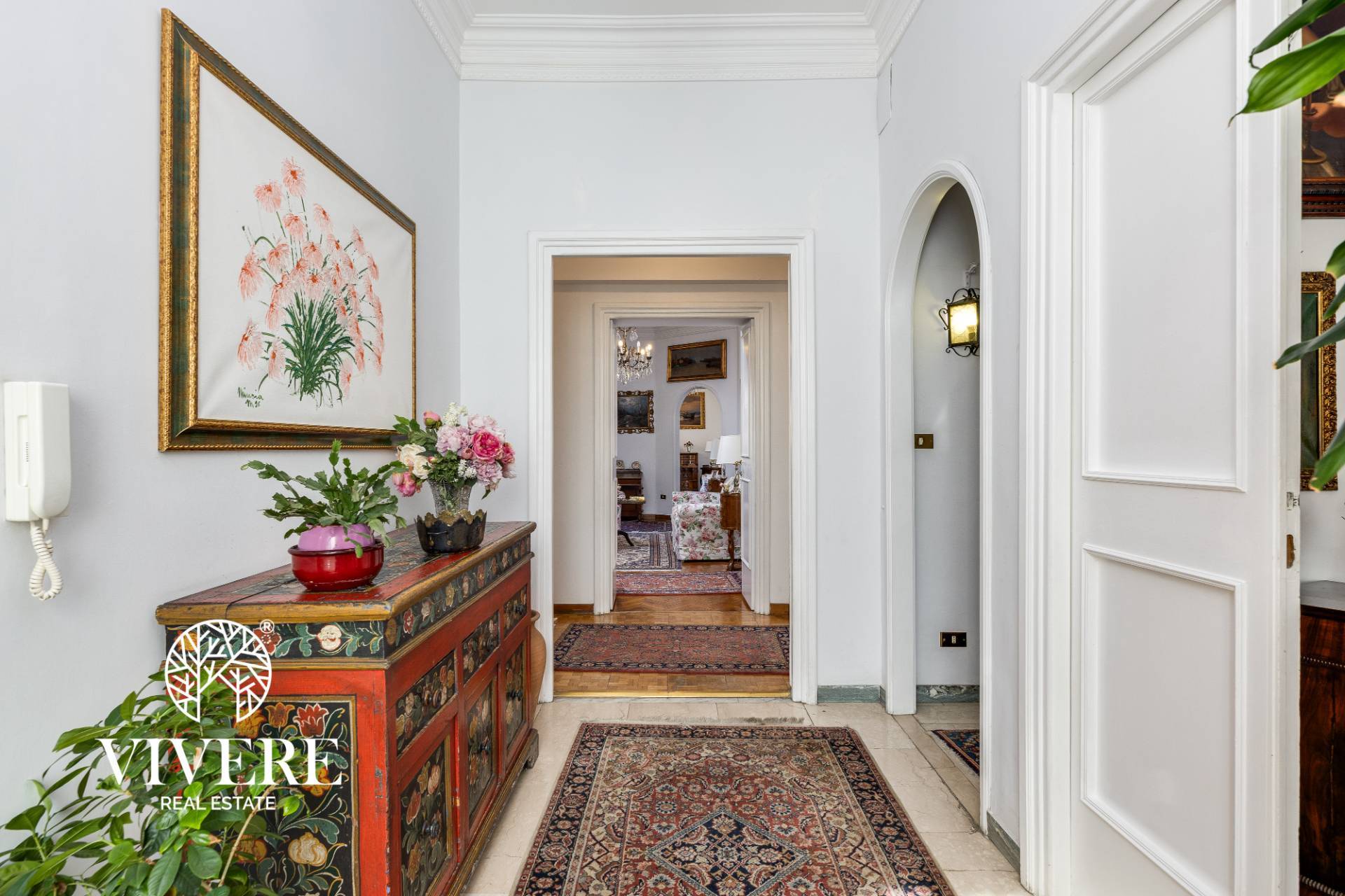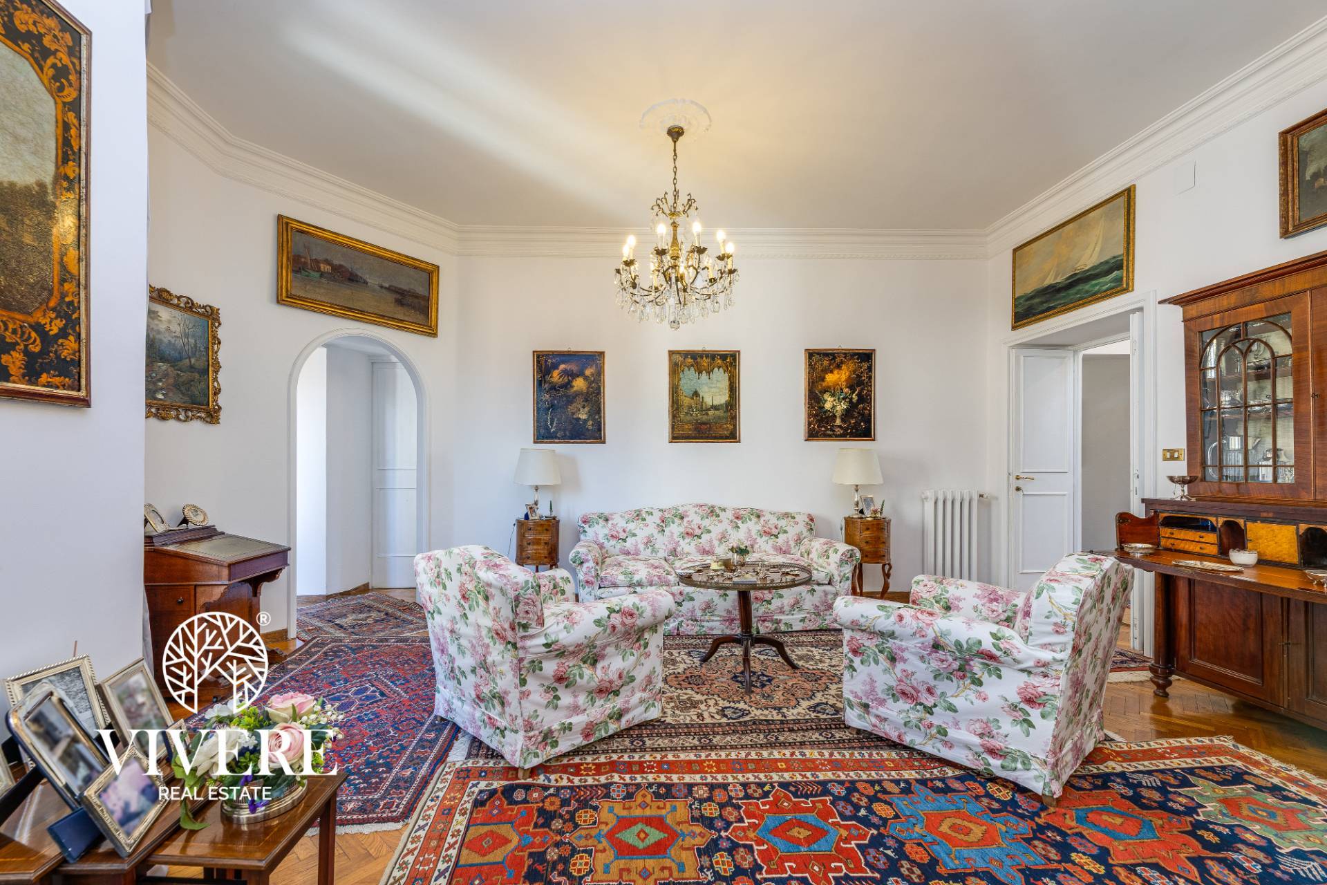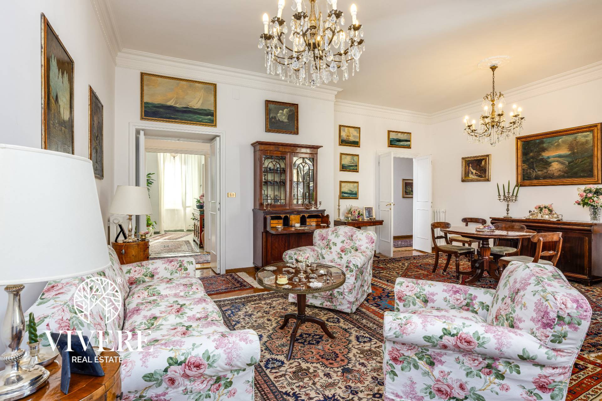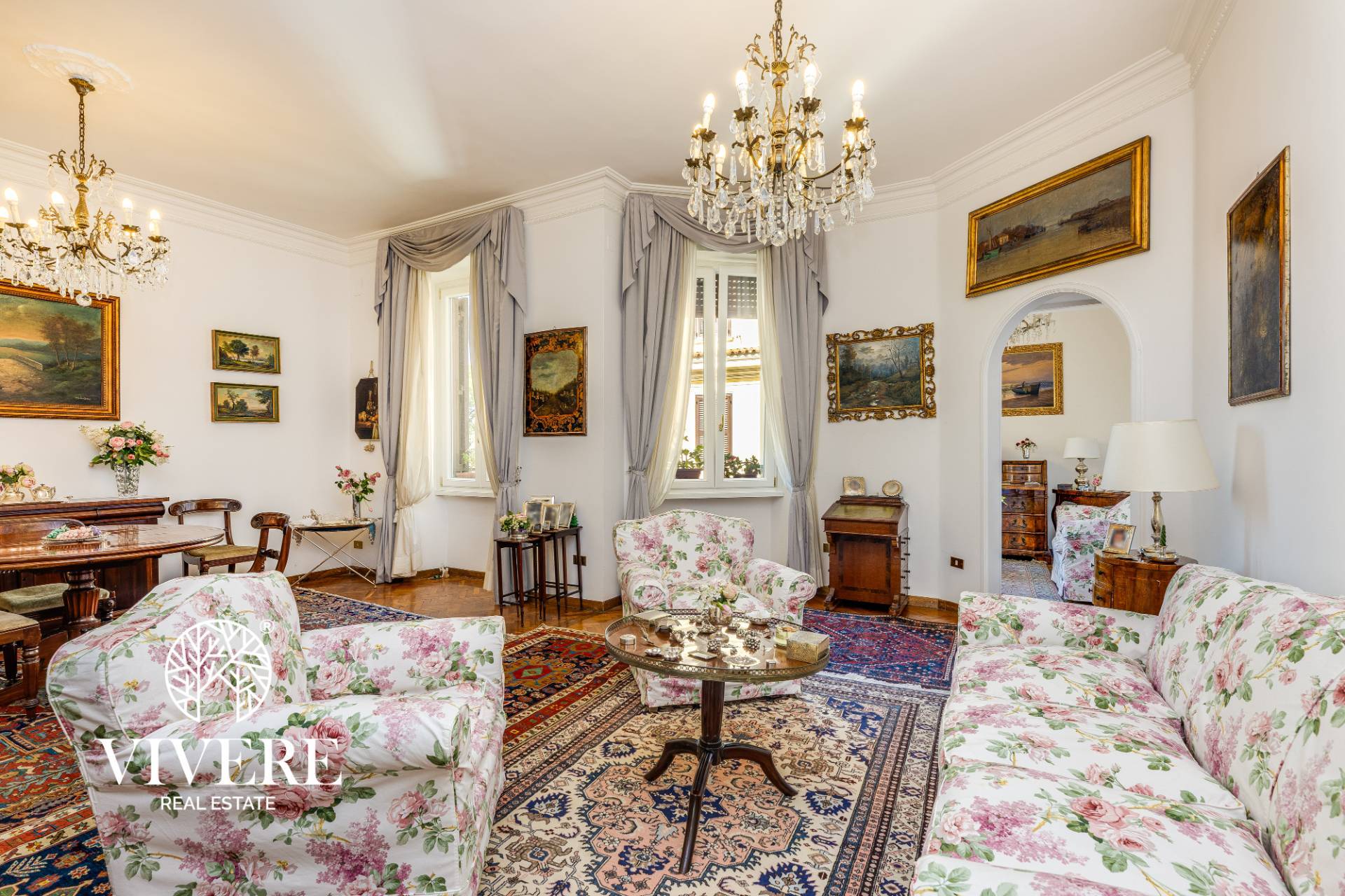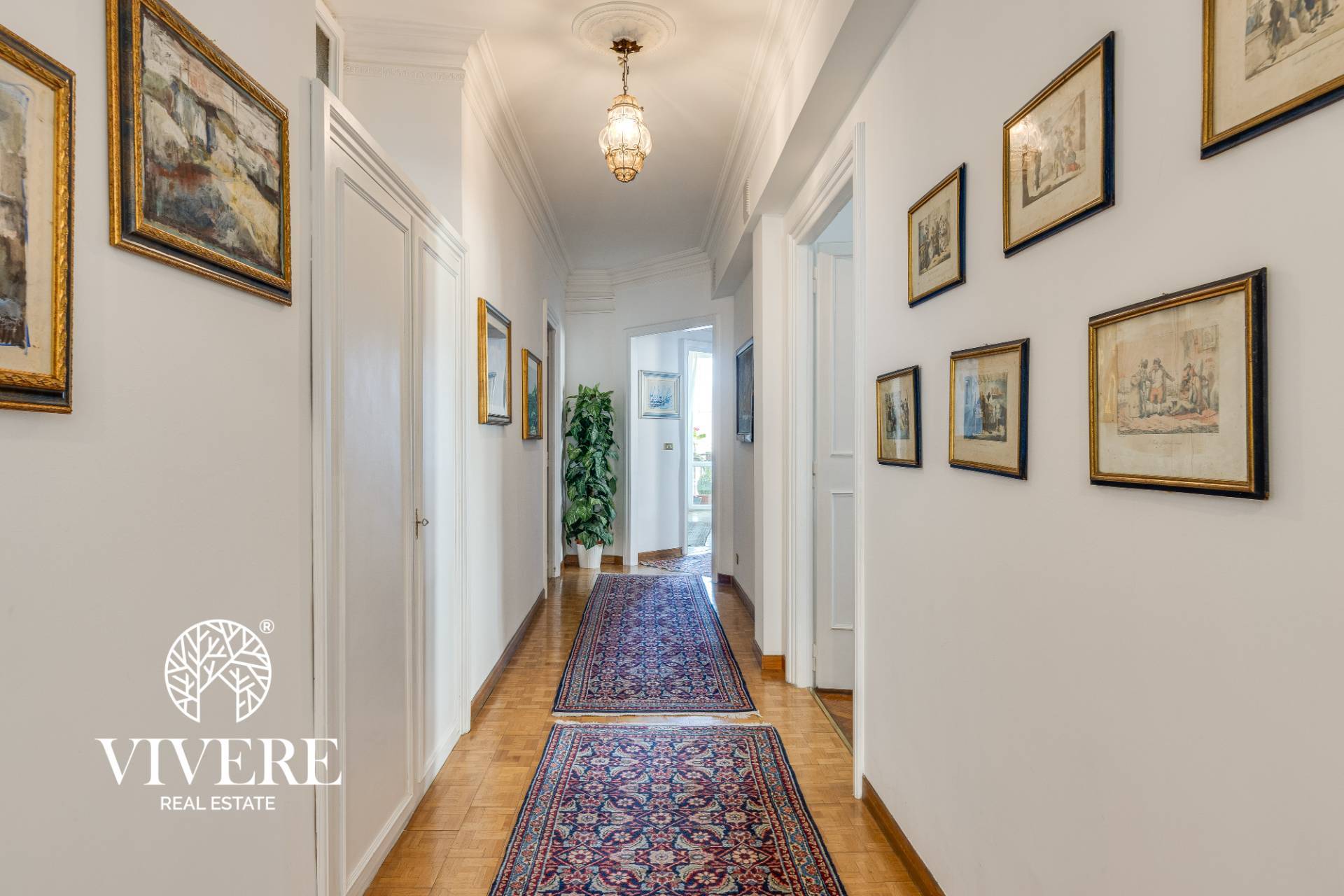 Limmobile gode di una tripla esposizione che garantisce ottima luminosit e suggestivi affacci sulla via, sui raffinati villini circostanti e con scorci panoramici sul ***.*******.**, di ampia metratura, si compone di: Ingresso di rappresentanza Due studi Salone triplo Cucina abitabile Tre camere matrimoniali Doppi servizi Ripostiglio Due balconcini Completano la propriet una cantina e una soffitta.