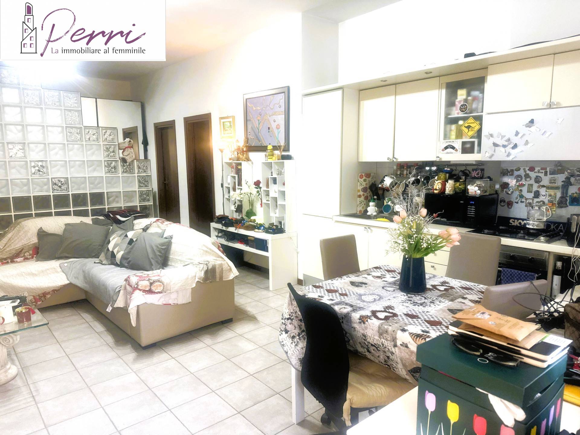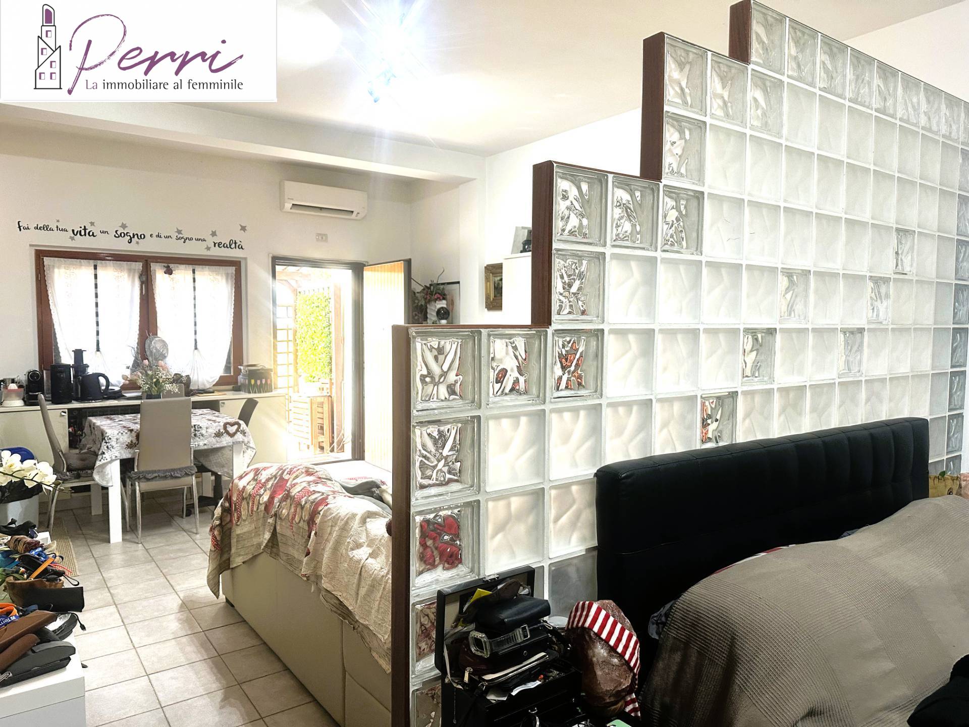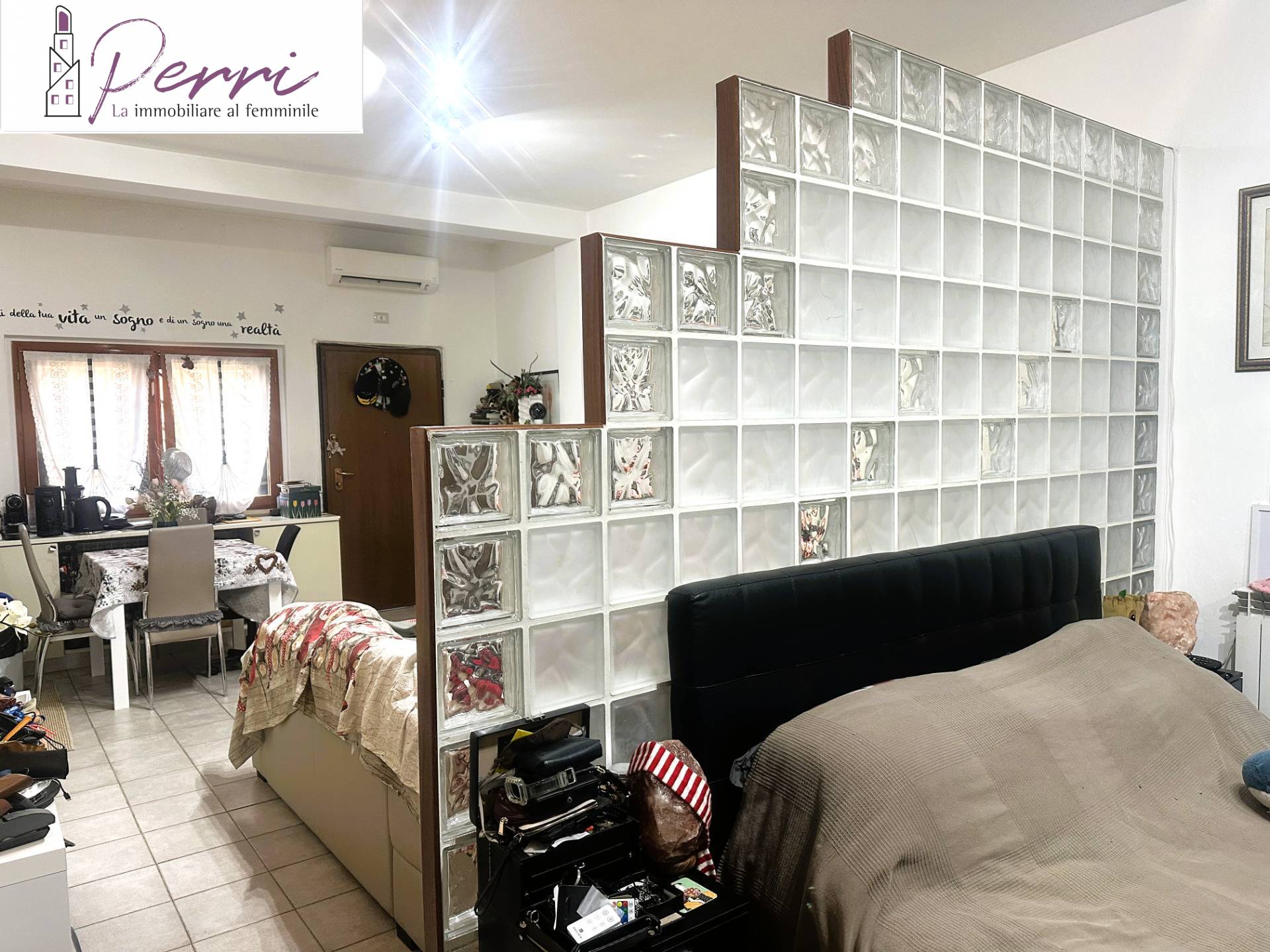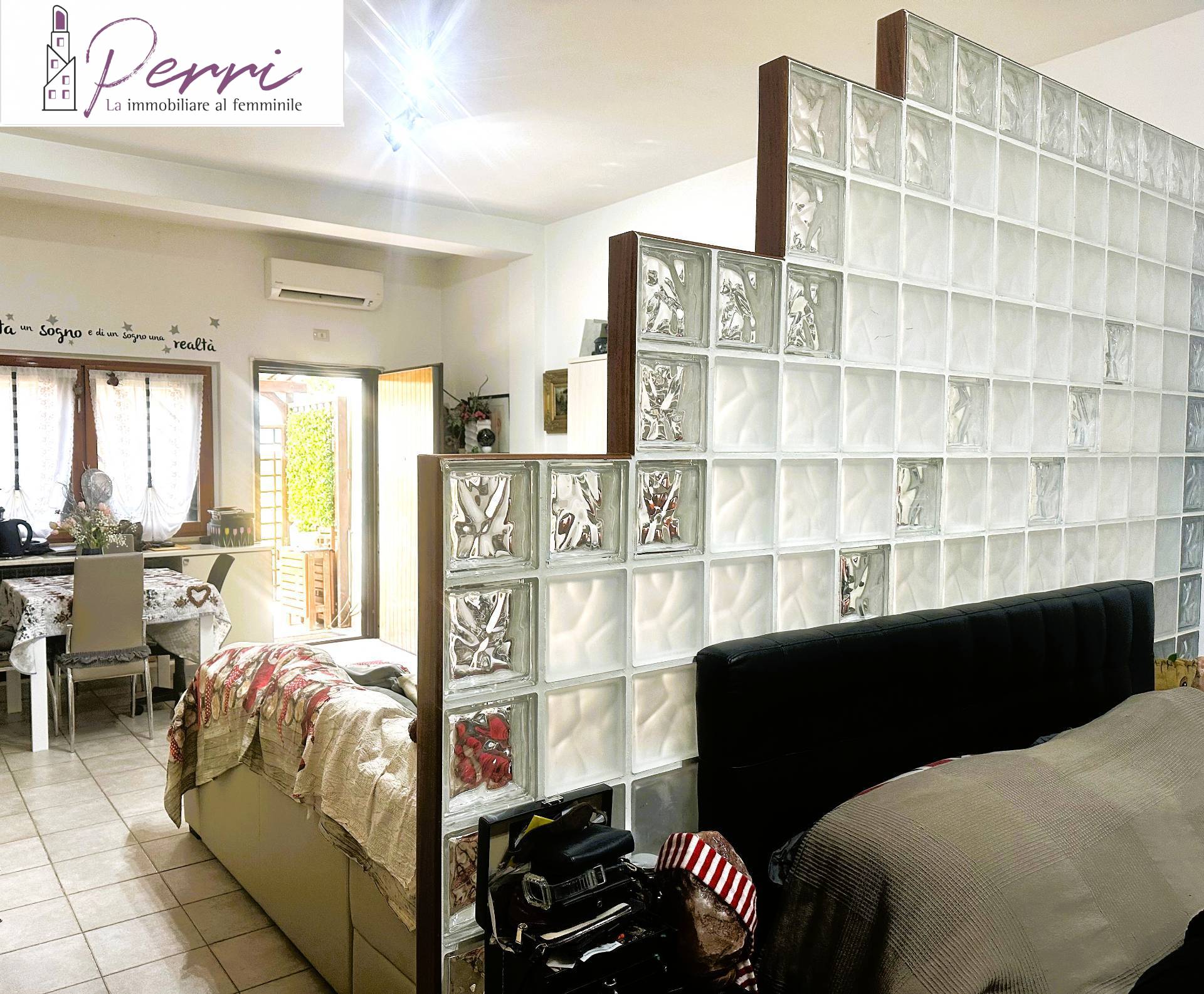 Limmobile composto da soggiorno con angolo cottura; una raffinata parete in vetrocemento specchiata separa elegantemente la zona giorno dalla zona notte.