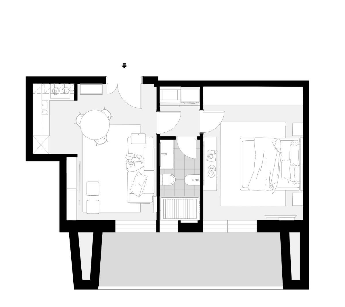 Lappartamento, frutto di un attento frazionamento, si distingue per una distribuzione degli spazi funzionale ed armoniosa: ingresso, soggiorno con angolo cottura, camera da letto e bagno finestrato.