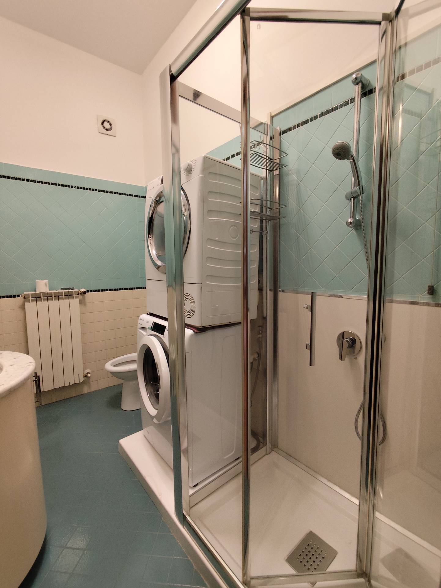 Il bagno, dotato di box doccia, lavatrice e asciugatrice.
