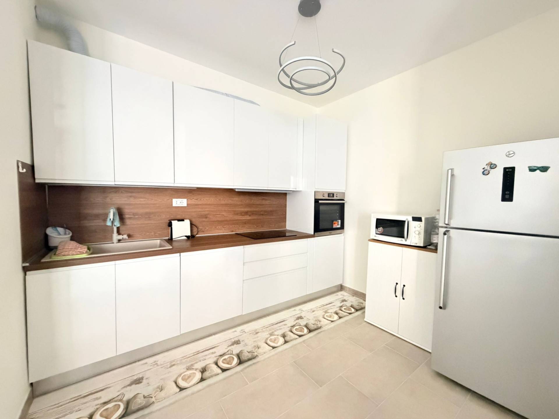 La zona giorno composta da ingresso su un grande open-space con cucina a vista, ampio vano studio/ripostiglio, lavanderia, mentre la zona notte composta da due camere da letto matrimoniali e da due bagni finestrati con box doccia di cui uno privato a servizio di una delle due camere da letto.