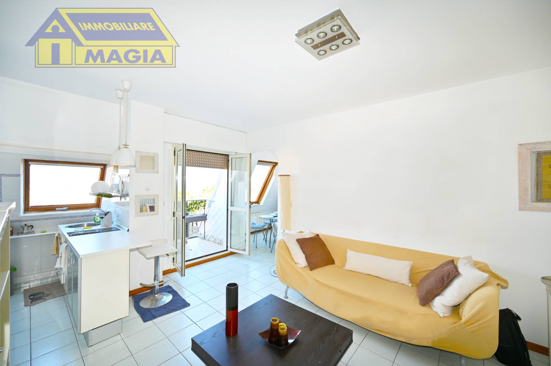Lingresso si apre su un ampio e luminoso soggiorno con cucina a vista, impreziosito da un balconcino con scorcio sul mare e una graziosa zona pranzo separata.