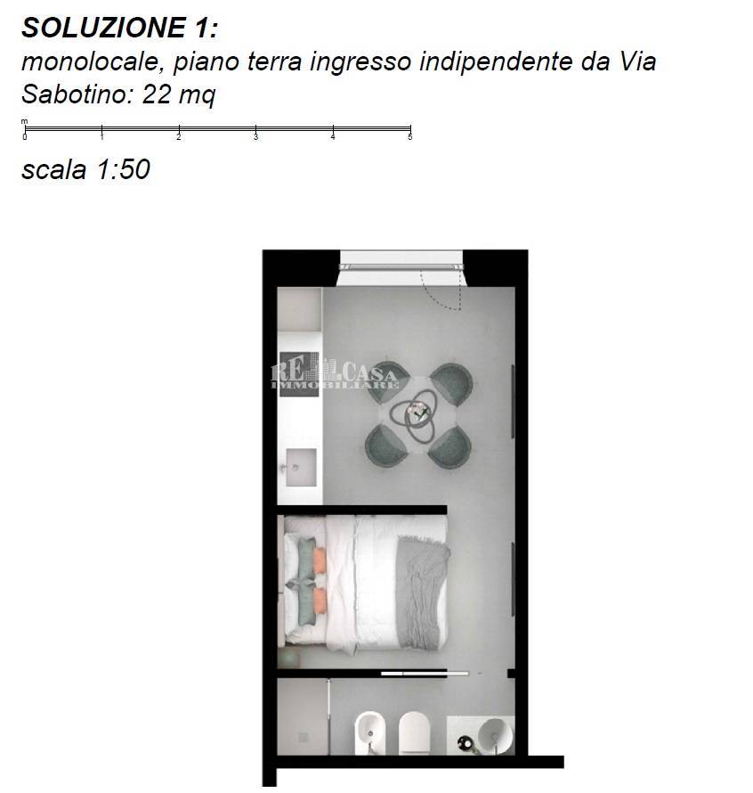 Monolocale di 22 mq al piano terra con ingresso autonomo composto da ingresso su soggiorno con cucina open-space, una camera da letto matrimoniale ed una doppia, un bagno con doccia con areazione forzata.